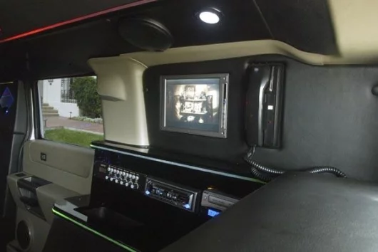 It has 4 televisions, a DVD player, a 1400 watt Kenwood sound system, laser light show, changing color neon lights, and glass-topped, pull out trays all-round.
