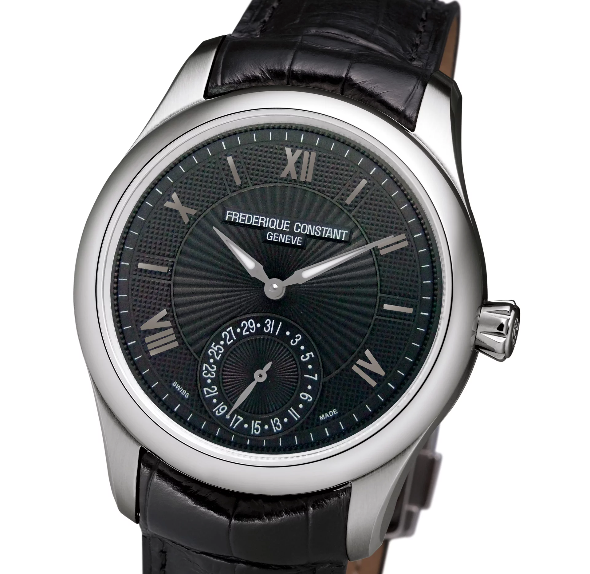 When the crown has been withdrawn to its first extracted position, turning it clockwise resets the date and turning it counter-clockwise triggers the GMT hand (with the red tip) to advance in hourly increments.