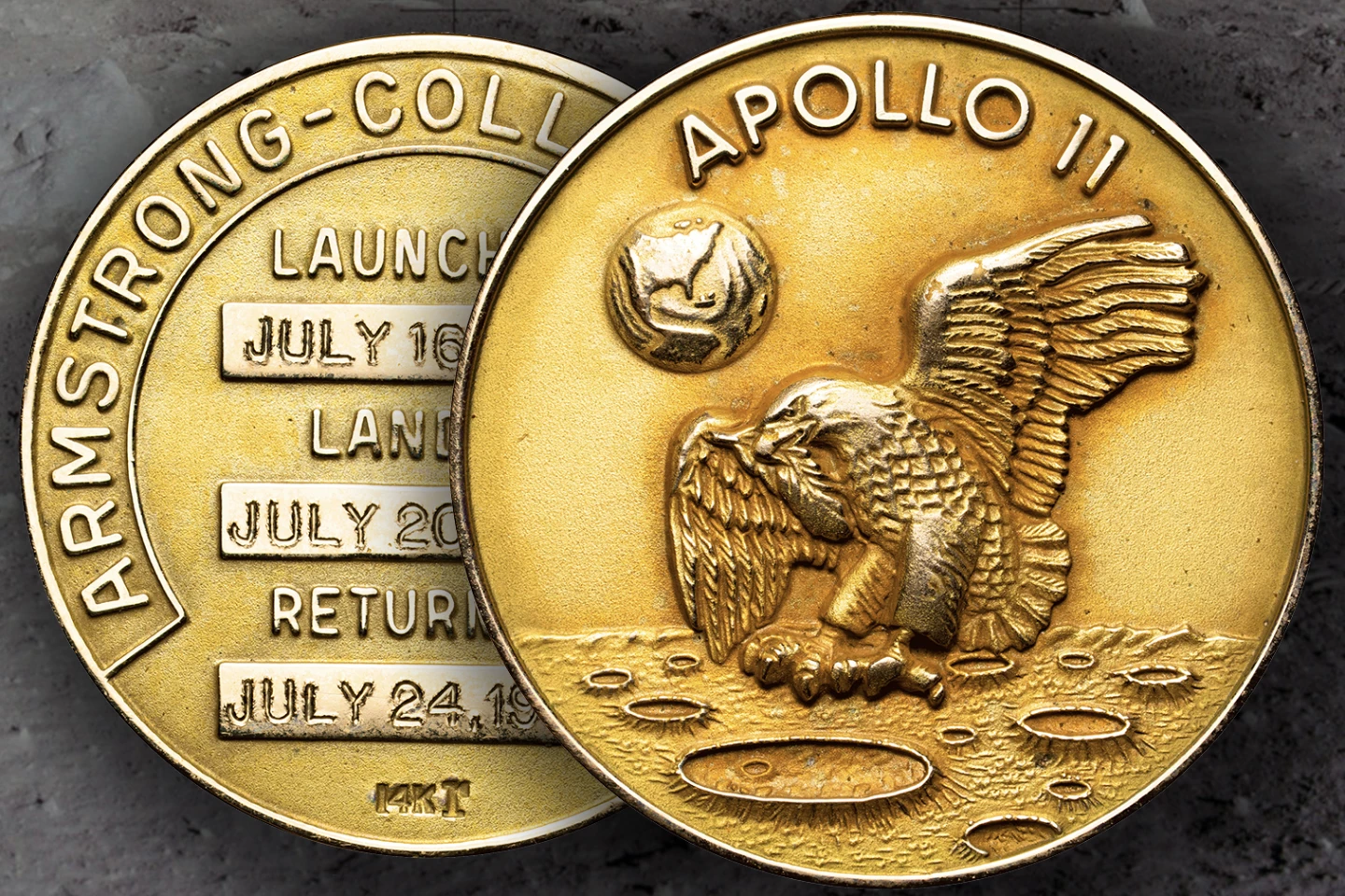 One of three specially-minted gold medals flown aboard Apollo 11, on then to the surface of the moon in the Lunar Module Eagle. There were 400 medallions aboard Apollo 11, but just those three, being one each for Neil Armstrong, Michael Collins, and Buzz Aldrin, went to the surface of the moon. This medal comes from the Armstrong Family collection and is one of the three.