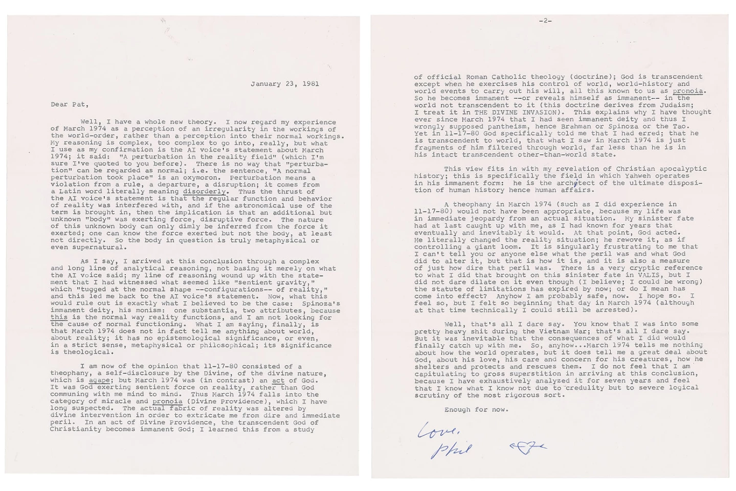 A two-page signed letter by one of the most influential science fiction writers of all-time. Philip Dick published 44 novels and around 120 short stories, almost all of them in the sci-fi genre. Dick's works have been produced as movies many times, including Blade Runner (1982), Total Recall (in 1990 and again in 2012), Minority Report (2002), A Scanner Darkly (2006), and The Adjustment Bureau (2011). The novel The Man in the High Castle (1962) was made into a multi-season television series by Amazon in 2015