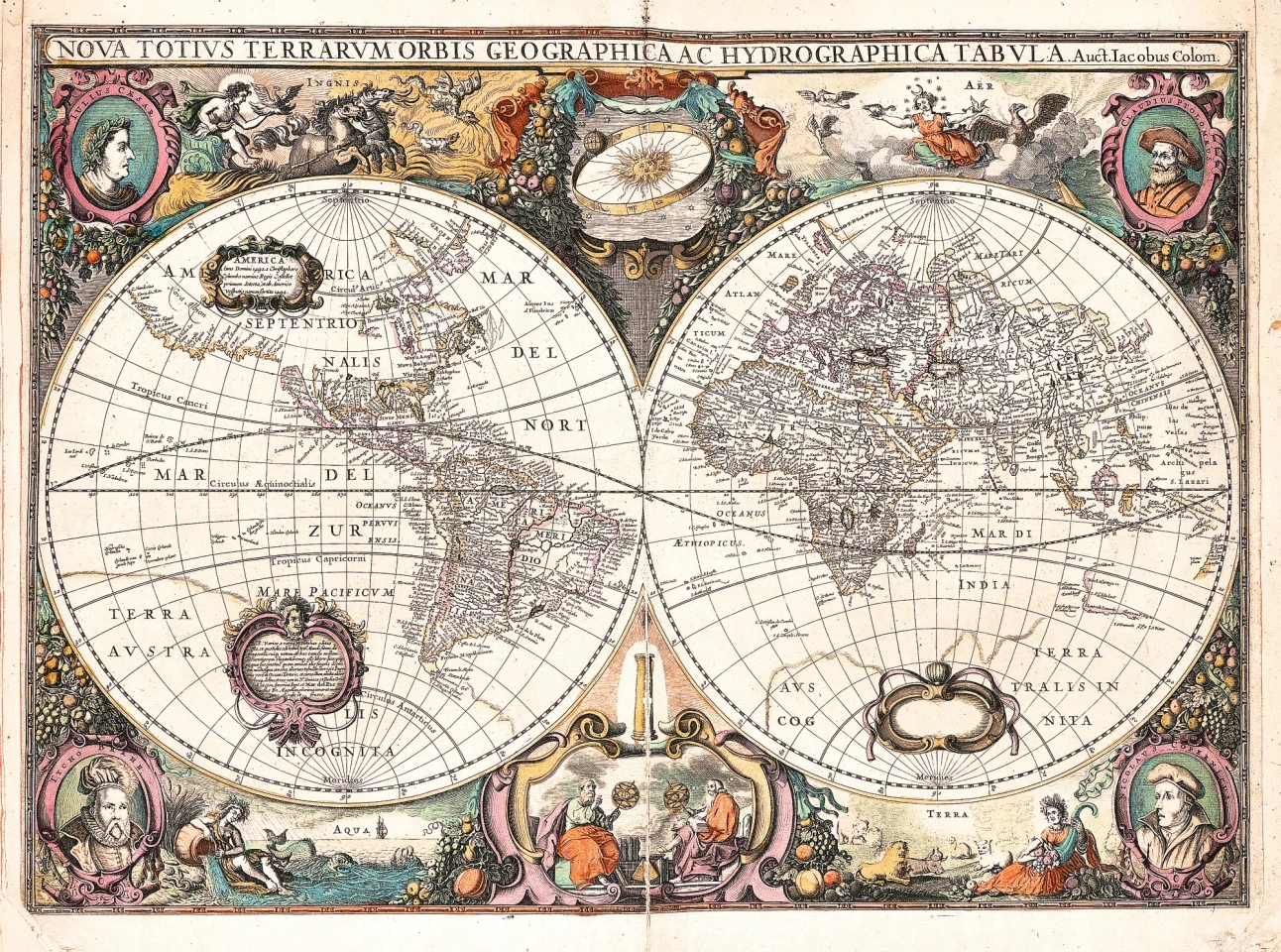 This hand-colored maritime atlas combines baroque artistry with a technical ability that resulted in a half century of steady publication for the atlas from 1680 to 1734. Beginning publication in 1680, the first edition of this book contained only 36 charts but this edition published eight years later contains 135 numbered double-page engraved charts.