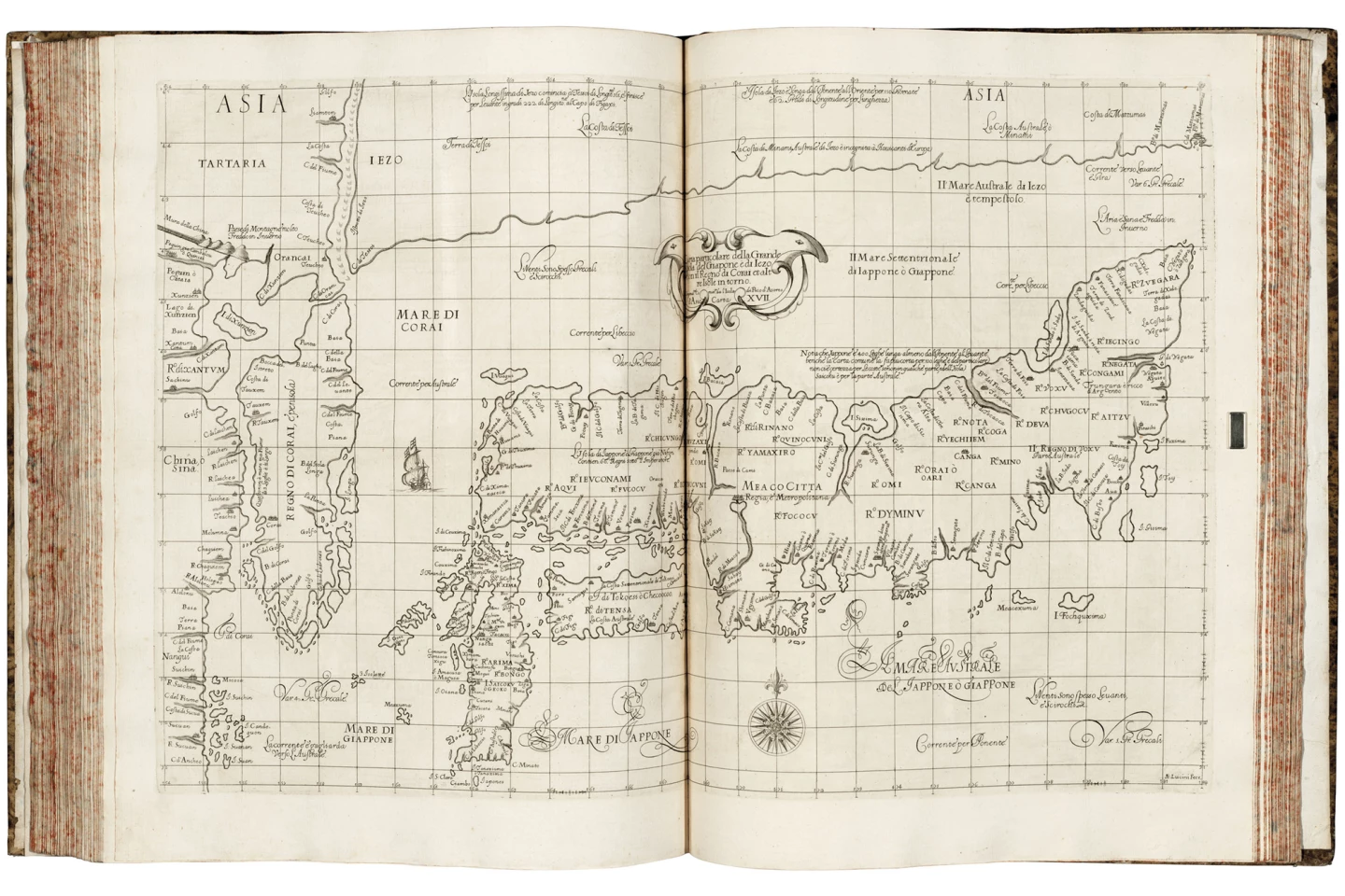 Printed in six parts as two broadsheet (565 x 420mm) volumes, Arcano del Mare by Sir Robert Dudley is one of the landmark texts in history for many reasons. It was the first ever sea-atlas, the first atlas with all the charts produced using Mercator’s projection, the first to give prevailing winds and currents, the first to give magnetic declination, and the first to expound the benefits of ‘Great Circle Sailing.’