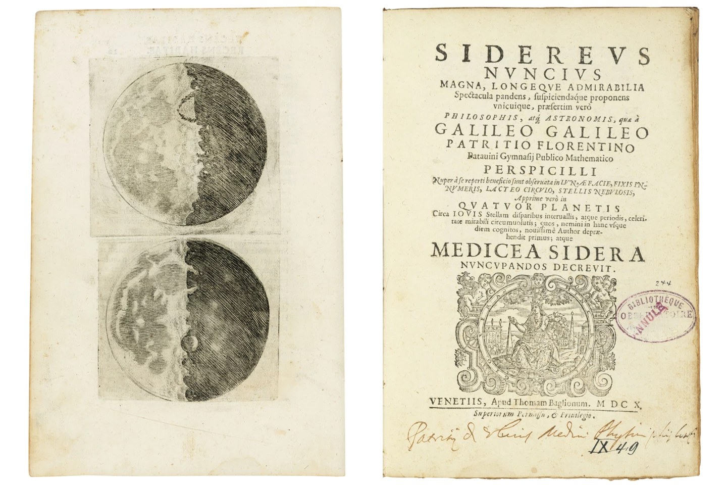 Galileo did not invent the telescope, but when he heard about the device being built in Holland in 1609, he set about making his own. Within a few months, he had improved upon his first X9 magnification to a X32 magnification, pointed it towards the heavens and then published his observations in this book in 1610. Those observations included the first details of Jupiter's four moons and his revelations about galaxies such as the Milky Way consisting of numerous stars. The drawings he made of the craters of the moon were published in this book for the first time and, building upon the previously published work of Nicolaus Copernicus, helped to change mankind's understanding of the universe from a geocentric (everything revolves around the Earth) model to a heliocentric (centered on the Sun) model.