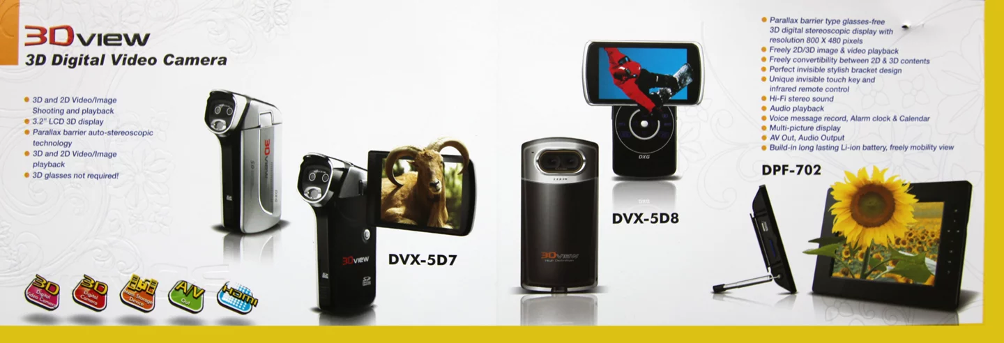 DXG is a Taiwan-based manufacturer that has been one of the first responders in the area of 3D content creation for the masses. Although it won't say much about pricing or availability, it was showing a number of 3D still image and 3D video cameras at Computex. Despite a grilling the company provided very little in the way of extra information aside from that already available in a brochure at the company’s booth. The company’s 3D video camcorder offerings included the DVX-5D7 and DVX-5D8. The DVX-5D7 is a pistol-grip camcorder, while the DVX-5D8 sports a unique Flip-like form factor with the rear of the unit twisting sideways to expose the camera’s controls and change the orientation of the display to widescreen. It appears the form factors are where the difference between the two models ends.