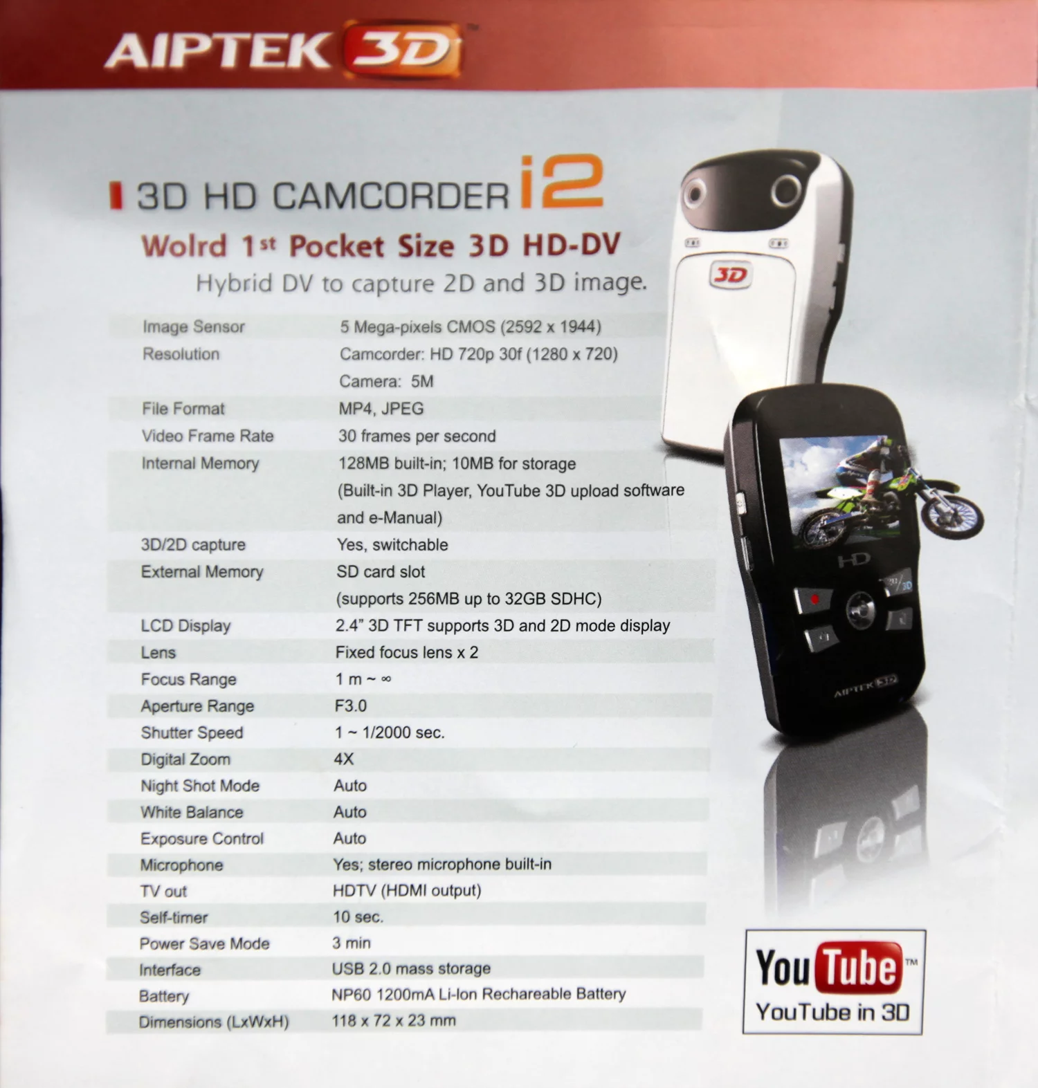 Aiptek’s i2 ups the 3D resolution to a more respectable 1280 x 720p thanks to its two 5-megapixel CMOS sensors. Like the DXG offerings, the i2 allows 3D video to be viewed without glasses on its 2.4-inch display using the parallax barrier method and can also capture 5-megapixel still images. The i2’s Flip-like form factor allows its dual lenses to be spaced further apart than the DXG offerings, which could help produce a more noticeable 3D effect, although the proof is obviously in the watching. The i2 comes with USB 2.0 and an HDMI port.Aiptek has said the i2 will be available this August for around US$200 and will apparently come bundled with YouTube 3D upload software and a pair of 3D glasses (of the red and cyan variety) to watch recorded video on a computer screen.