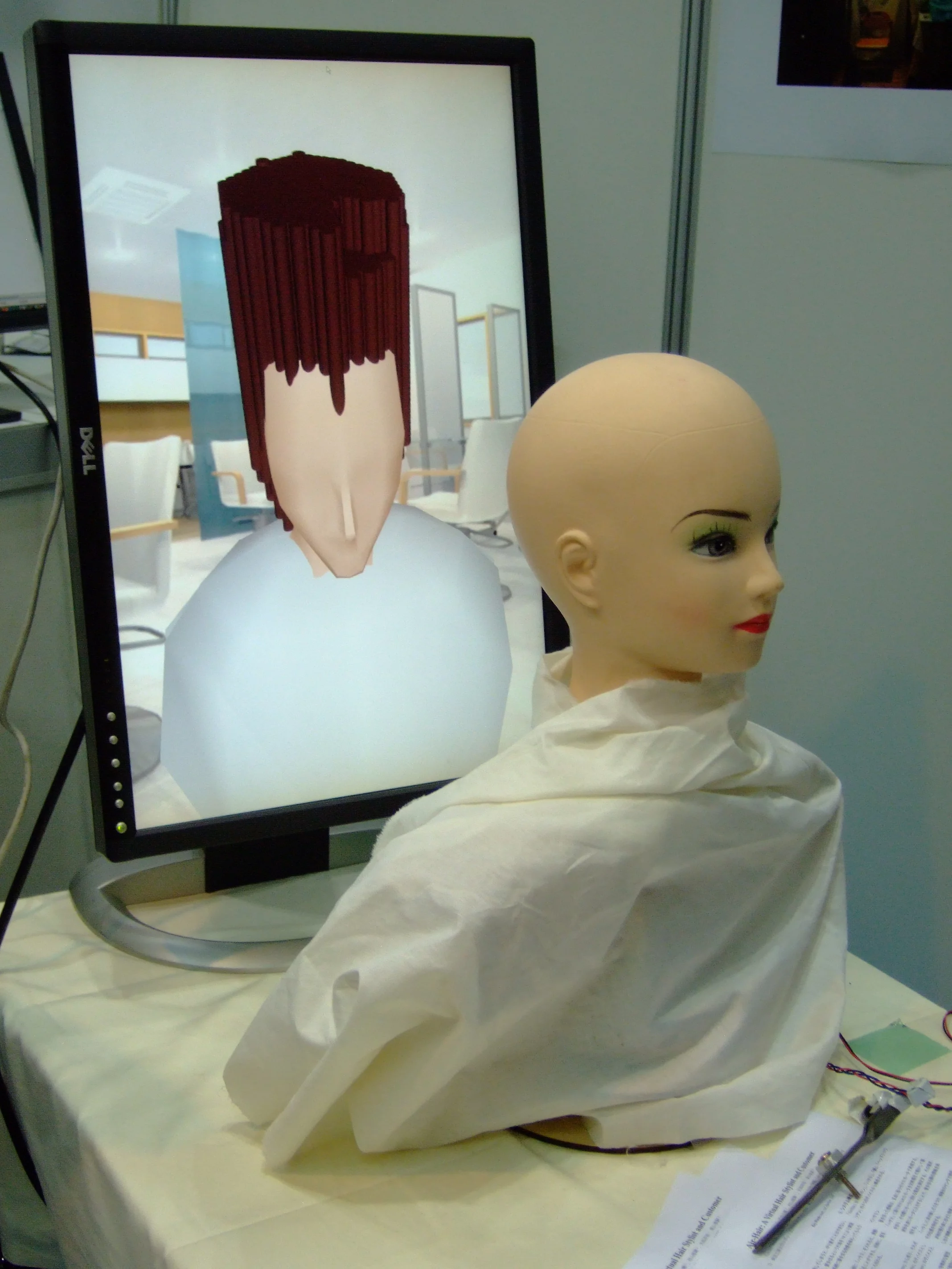 At the 3D and VR Expo in Tokyo last week, a team from the Tokyo Institute of Technology were demonstrating a virtual reality haircut simulator. With a real scissors mechanism and a physical dummy, the simulator would display the virtual hair on screen which falls to the ground as you trim it.