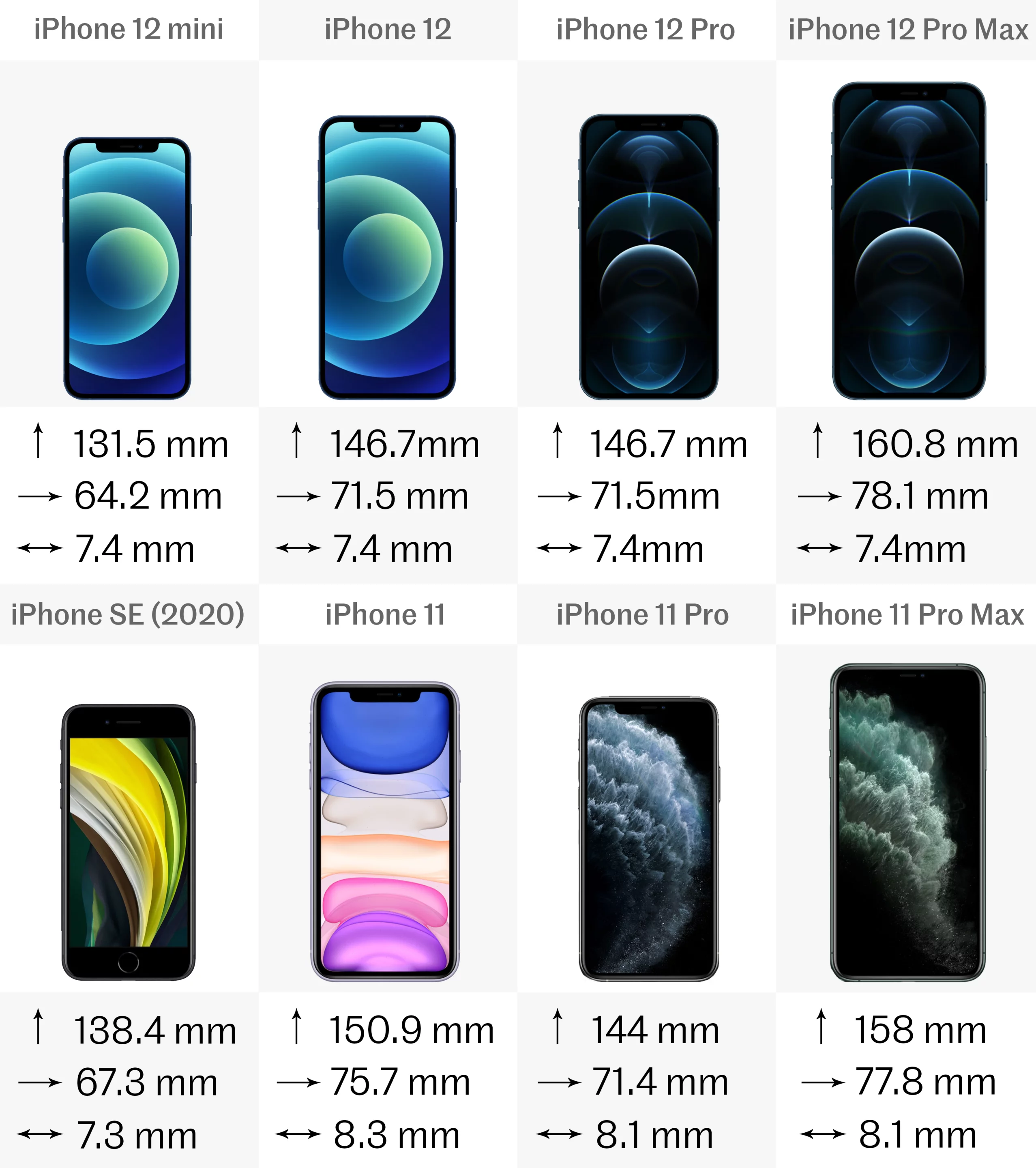 Even though Apple has now stopped directly selling the 11 Pro and Pro Max, we’ve included them in this comparison because they’re still easily bought from other vendors. And of course, it may help those who already own these models and are wondering if it’s worth the upgrade. The second generation iPhone SE is here too, because it’s still a viable option having only released earlier this year.Size