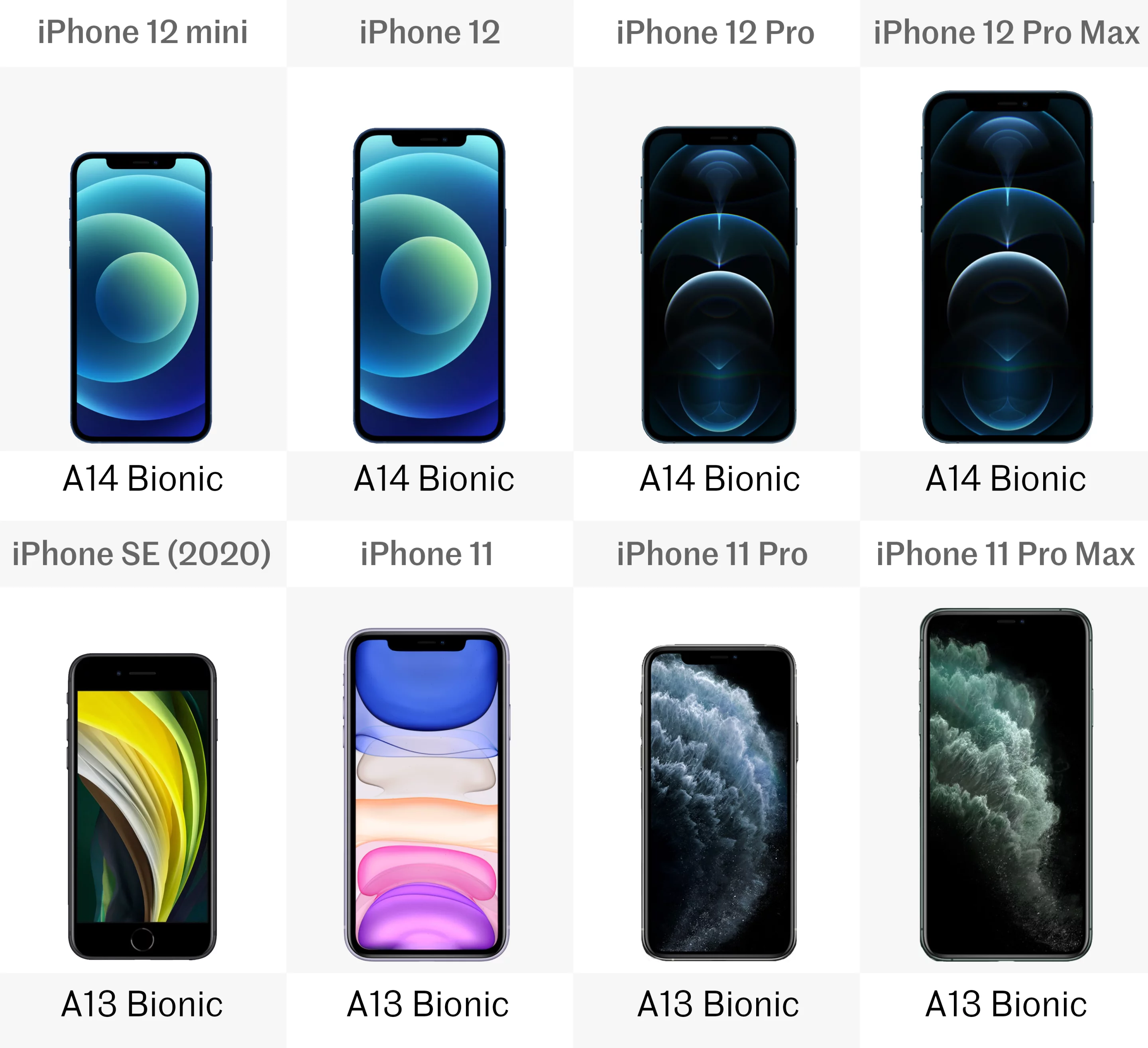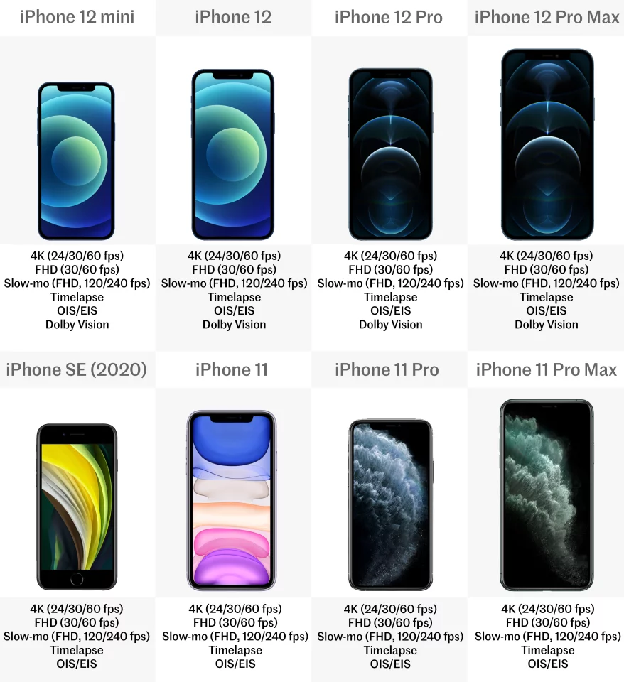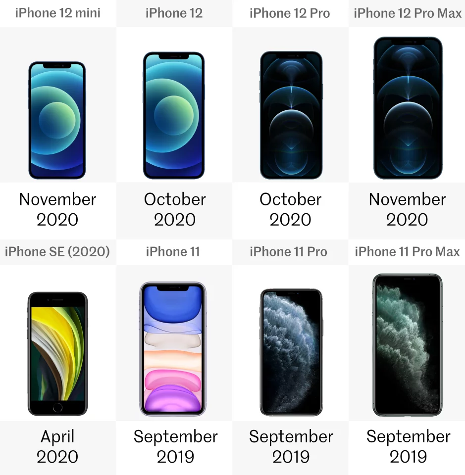 Being Apple devices, all eight iPhones are of course running on iOS. The iPhone SE and 11 series come with iOS 13 preinstalled, while the iPhone 12s are loaded with the new iOS 14. The older phones can be upgraded to the new system too though.Release date