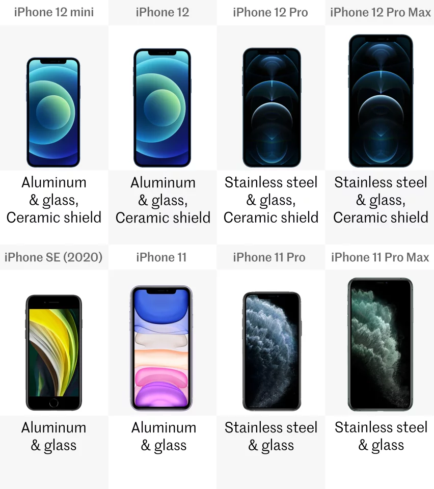 All eight of these iPhones are made with glass front and back, ringed with a metal. On the iPhone SE, 11, 12 and 12 mini that’s aluminum, and on the Pro and Pro Max models that frame is stainless steel.