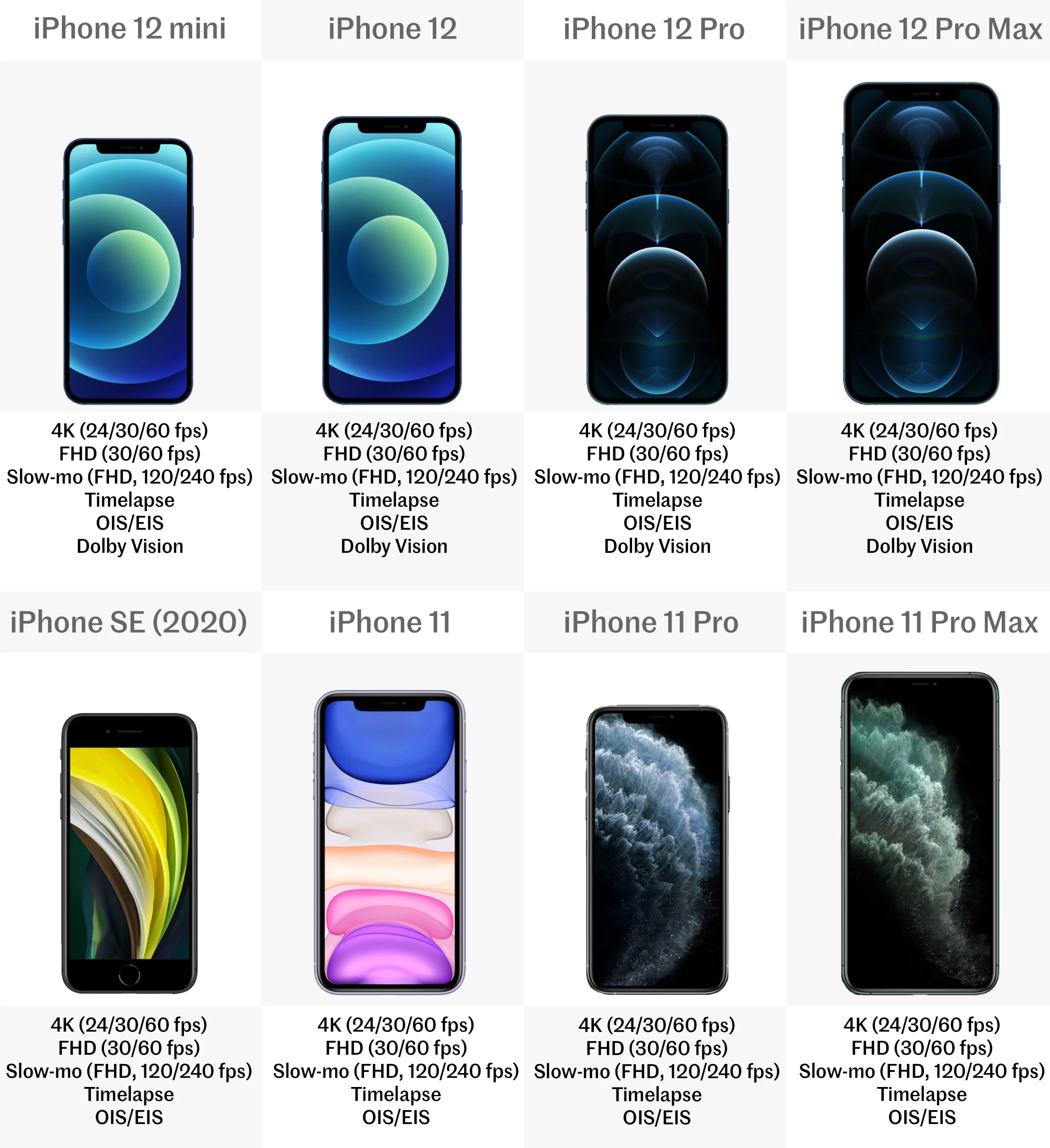 All eight of these iPhones have more or less identical video modes too. They can all shoot in 4K resolution at 24, 30 or 60 frames per second (fps), and in 1080p Full HD at either 30 or 60 fps.