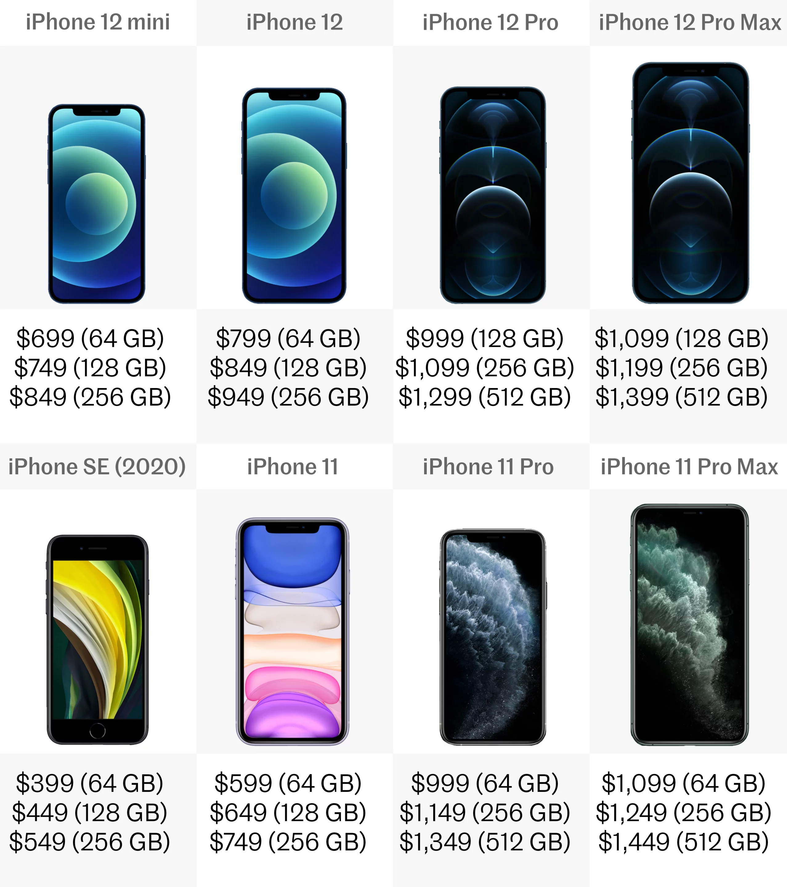 The iPhone 11 lineup launched back in September 2019, and the iPhone SE followed in April 2020. After a little delay thanks to the pandemic, the iPhone 12 and 12 Pro will launch in October 2020, with the 12 mini and Pro Max following in November.Price (US$)