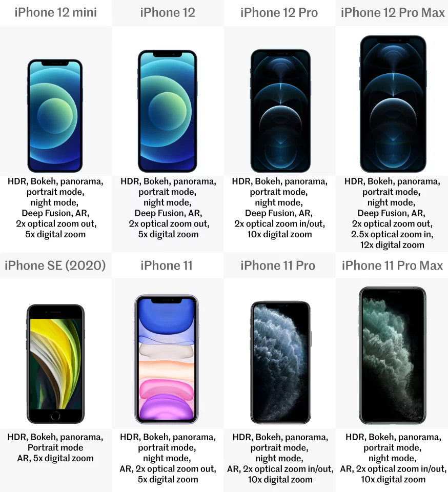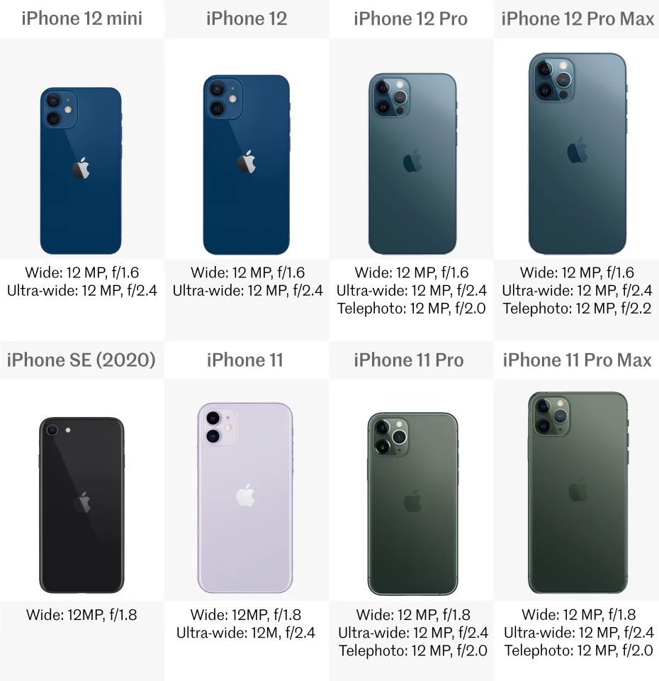 All eight phones start with a wide-angle, 12 MP camera. Everything bar the SE then adds an ultra-wide angle lens, also with 12 MP. And at the top of the line, the Pro and Pro Max models of the iPhone 11 and 12 round it out with a 12-MP telephoto lens.