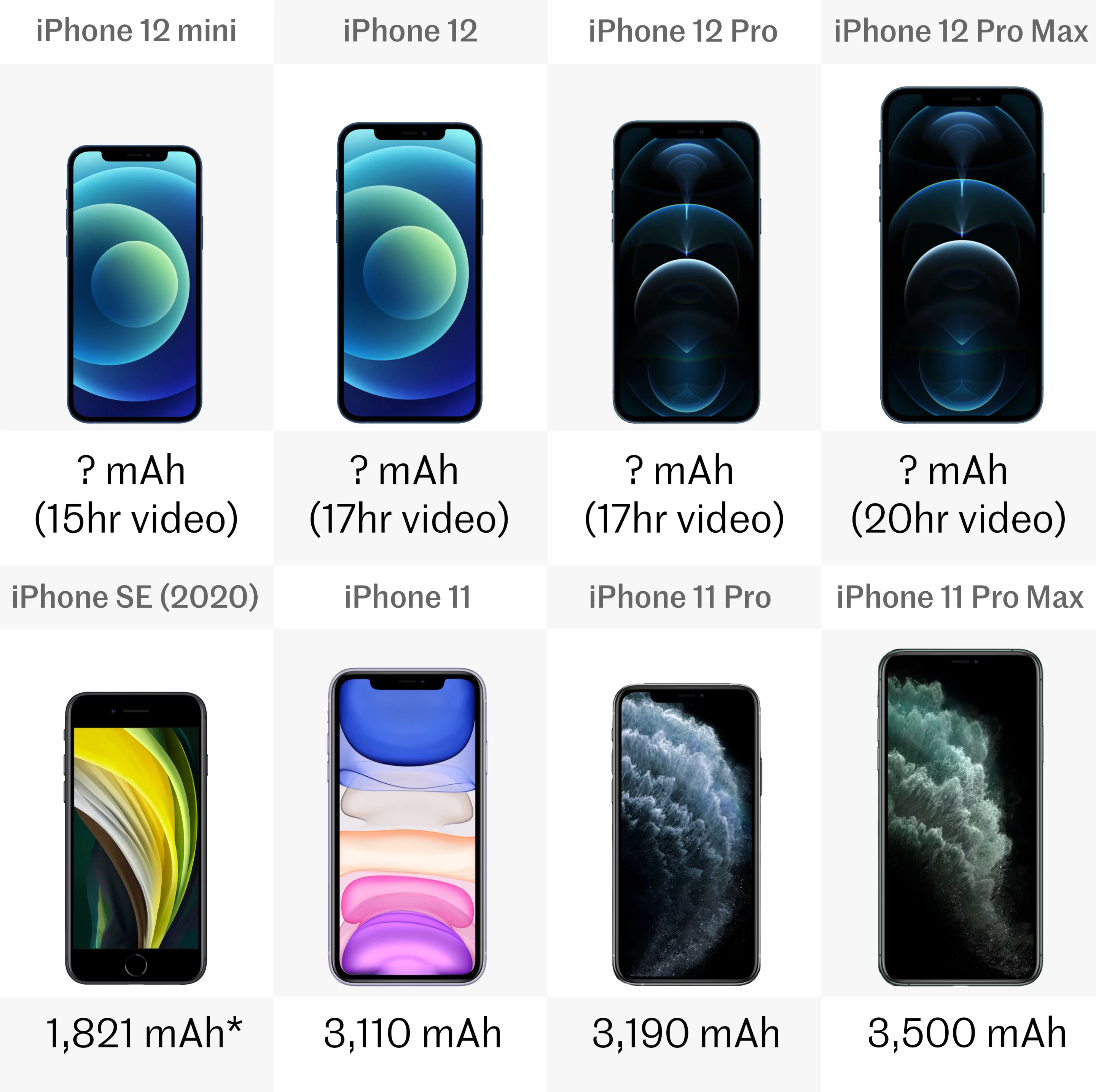 Like with RAM, Apple doesn’t officially disclose its battery capacity numbers, so again we can’t confirm them. But Apple says that you should get 15 hours of continuous video playback out of the iPhone 12 mini, 17 hours on the 12 and 12 Pro, and 20 hours on the 12 Pro Max. By the same metric the iPhone SE can last 13 hours, the iPhone 11 and 11 Pro last up to 17 hours, and the 11 Pro Max gets 20 hours.Fast charging