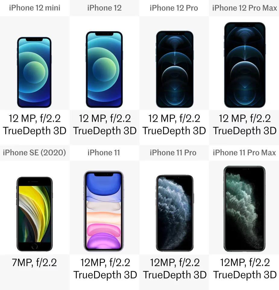The iPhone 12s have the same selfie cam as the 11s – a solid camera with 12 megapixels, and an aperture of f/2.2. They’re also equipped with depth-sensing technology that Apple calls TrueDepth 3D, which is what enables the Face ID facial recognition system.