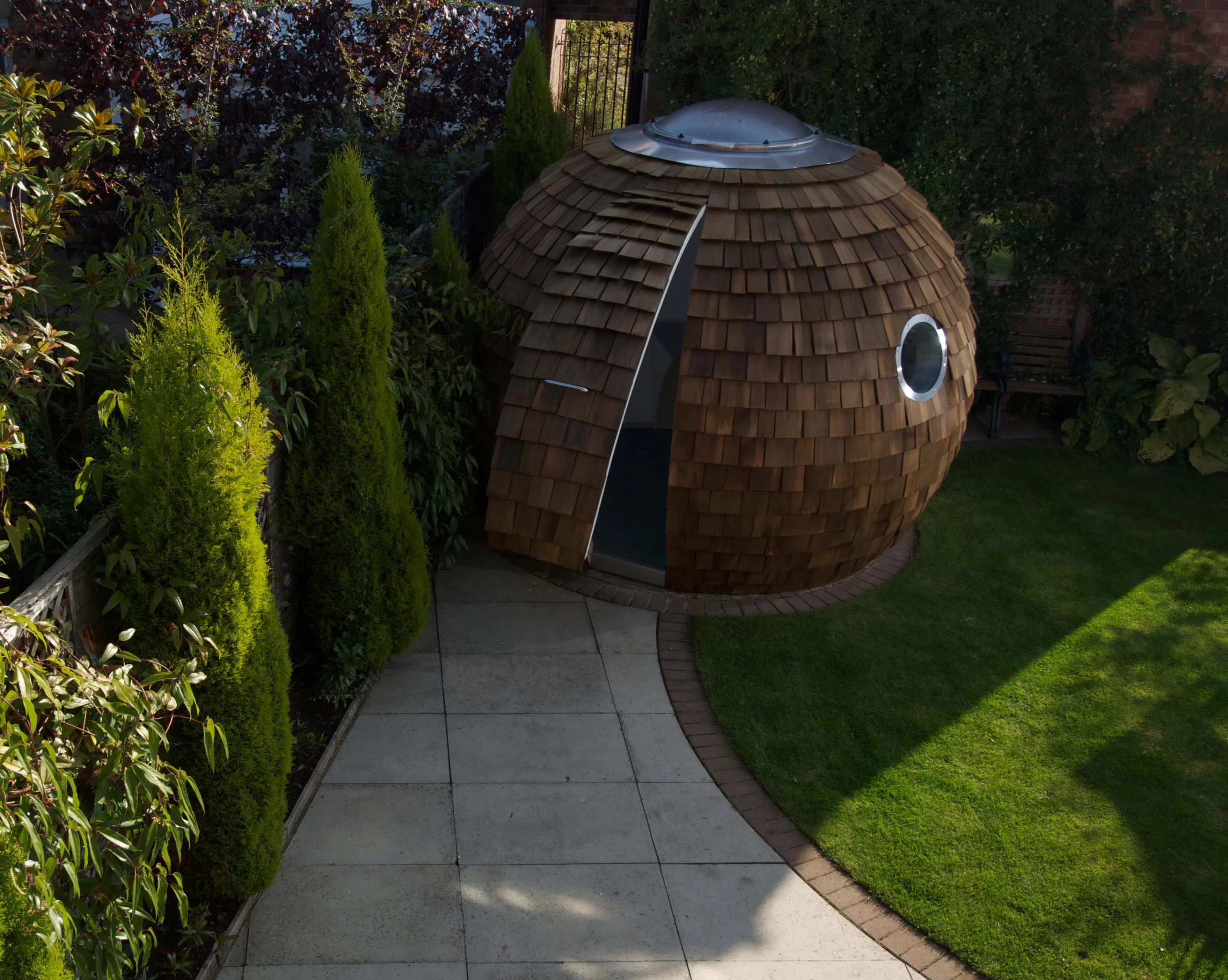 The Pod is prefabricated in sections – so if your garden is particularly hard to access, the Pod can be carried through your house. It measures approximately three meters (about ten feet) in diameter and has a height of two and a half meters (about eight feet).