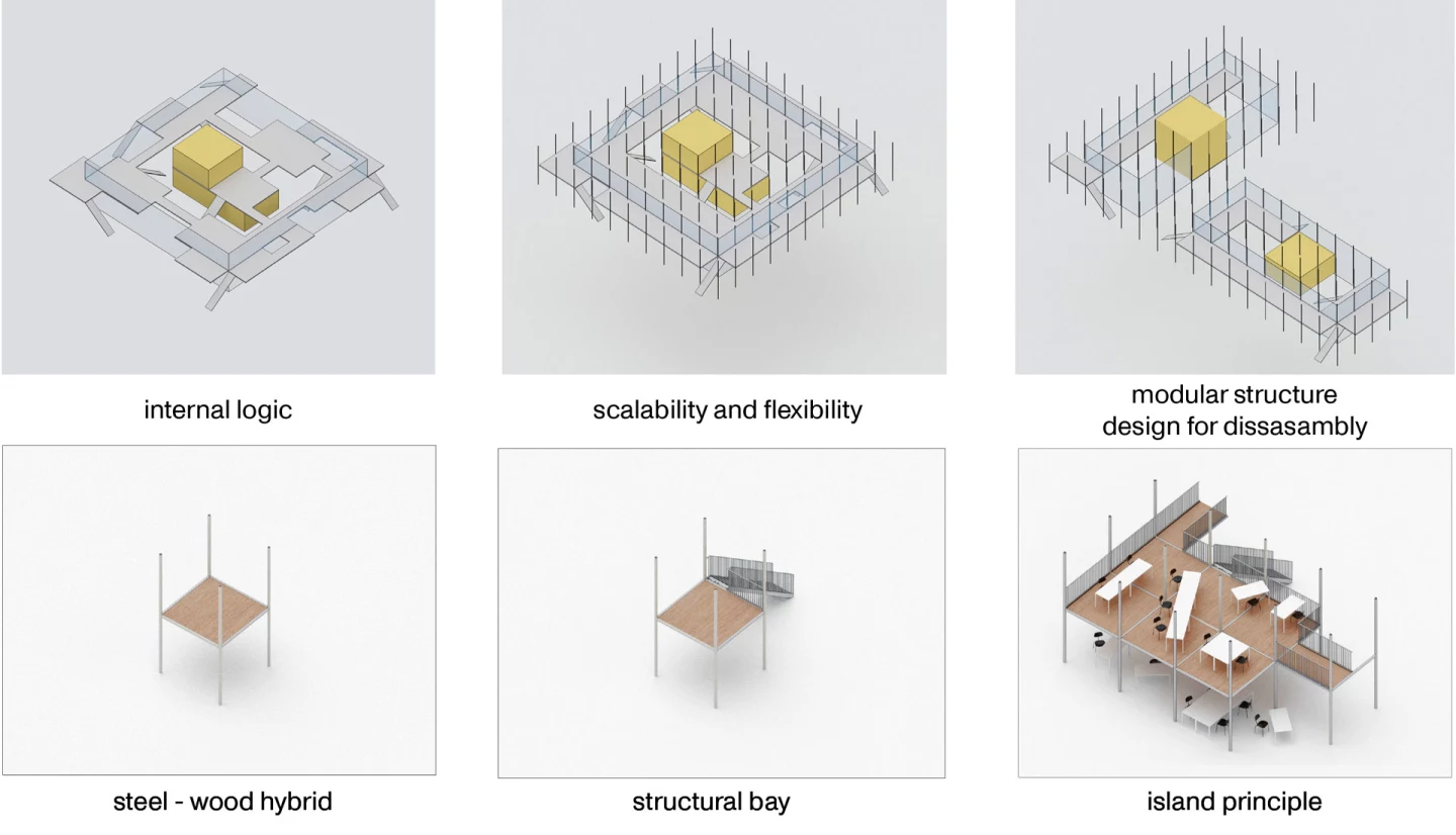 The building is designed as a structure of slender steel columns and beams with wooden platforms and is completely dismountable. Following the principle of “design for disassembly,” the structure can be recycled as a whole and rebuilt in a different form at another location.