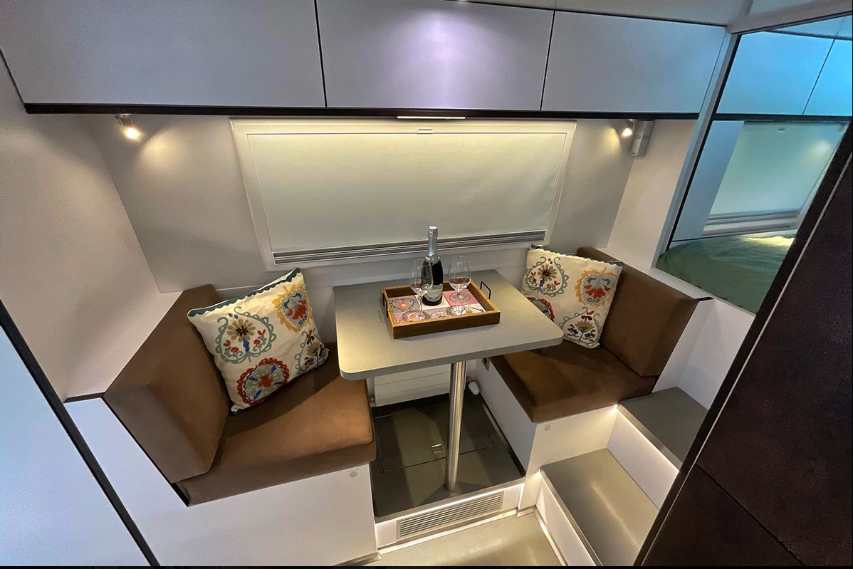 And what a camp it is. The 7400 offers the same general layout as the 7200 we looked at all those years back, albeit with a few larger spaces and furnishings. The front lounge grows into a wraparound dining area that converts into a roomy day sofa and extra bed set conveniently below the wall-mounted LED TV wired to Bose surround sound. A dual-bench lounge located diagonally across the aisle serves as a second dining space.
