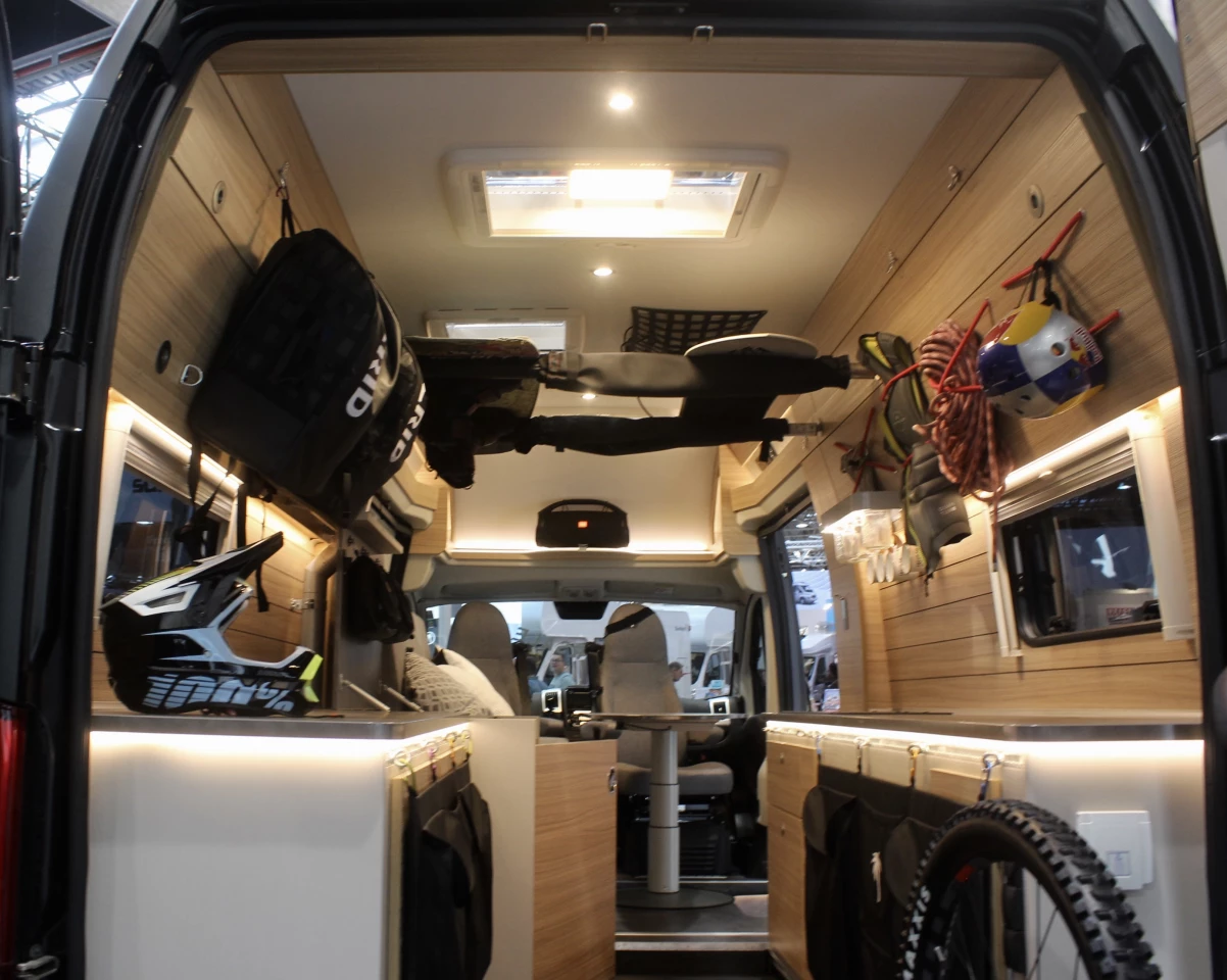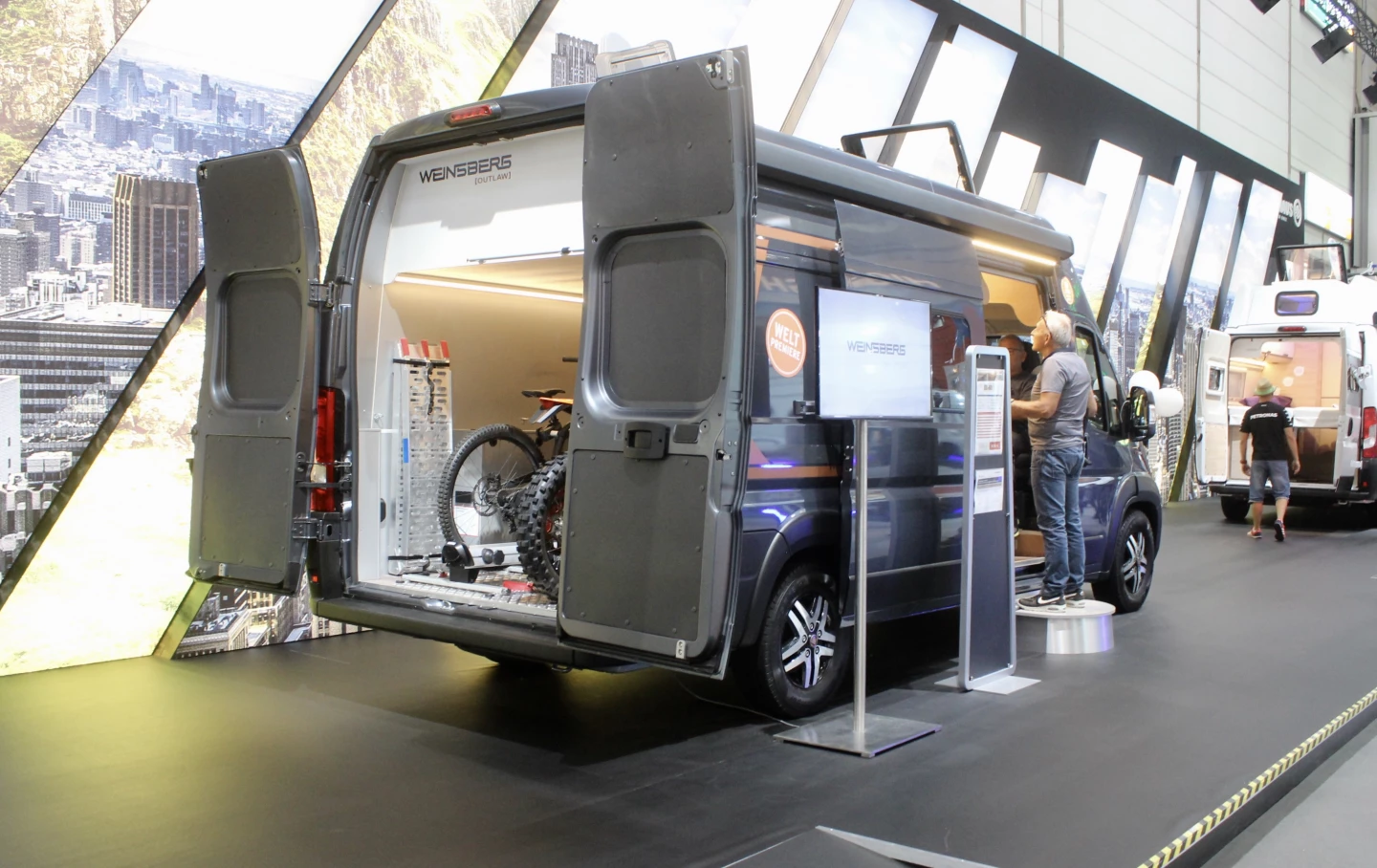 Whatever your two/four-wheel travel dreams, there are a few moto transporter vans perfectly equipped to make them reality, and the new Weinsberg 630 MEG [Outlaw] was the best van in Düsseldorf for the task. A full bike garage awaits inside the rear loading doors, and Weinsberg offers a foldable ramp and dirt bike carrier to simplify loading the bikes. It properly seals the garage off from the fully equipped camper interior, which has sleeping space for up to three people, a kitchen block and a wet bathroom. Bike hard all day, lock the bikes away at night and retire to the comfort of a warm camper van with roomy queen bed.