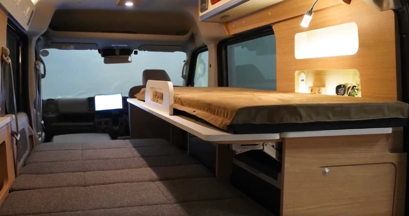 We continue to be amazed by how much functionality Japanese kei camper builders can squeeze into the tiniest vans on Earth. Oka Motors takes it to yet another level with its recently remodeled Miniature Cruise Cozy. The ingenious indoor/outdoor layout transforms in several directions, enabling a 134-inch-long Suzuki Every van to transport, feed, clean and sleep up to three occupants. The cabin-filling bed converts into a dinette and sofa, and the long, slim kitchen block extends in width to create a bunk bed, supporting everyone from solo digital nomads to small adventurous families.