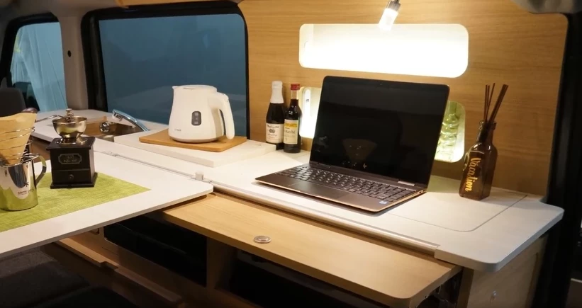 The loft bed isn't the only bit of slide-out trickery on the kitchen block. Hop outside the van around the tailgate, and the fridge slides out for quick outdoor access. Below the fridge slide, a second drawer stores the loft bed expansion panels and doubles as a worktop for holding the portable gas stove. The multipurpose dining table can also attach to the outside of the fridge slide to create a side table or tailgate dining area, keeping drinks stable with its sunken cupholders.