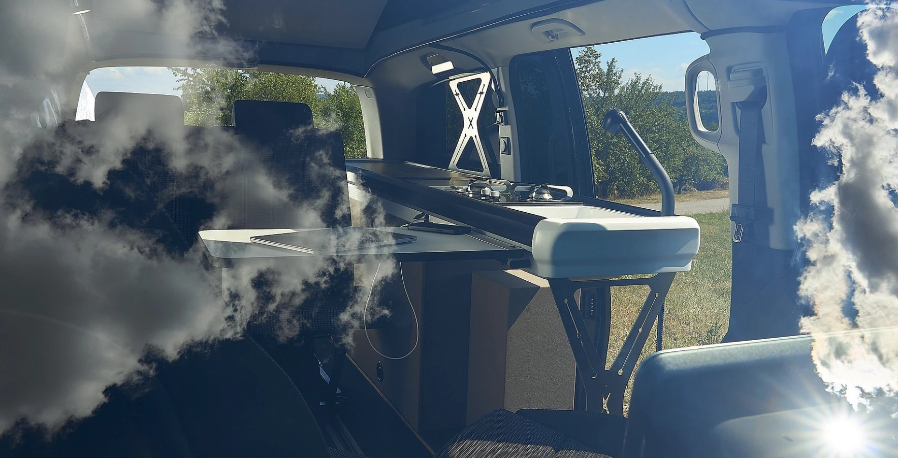 Those front and rear X supports hold up the extra-long kitchen counter while keeping the space below emptier than a traditional cabinet array. This provides much more storage flexibility, including the option of storing a bicycle transversely in the rear load area or sliding a carryon-size roller bag below the kitchen top. The X supports can also be used to lash climbing rope and carabiners, hook on bicycle helmets, carry camping mugs or cups, or otherwise keep sports or camping gear immediately available inside the tailgate.