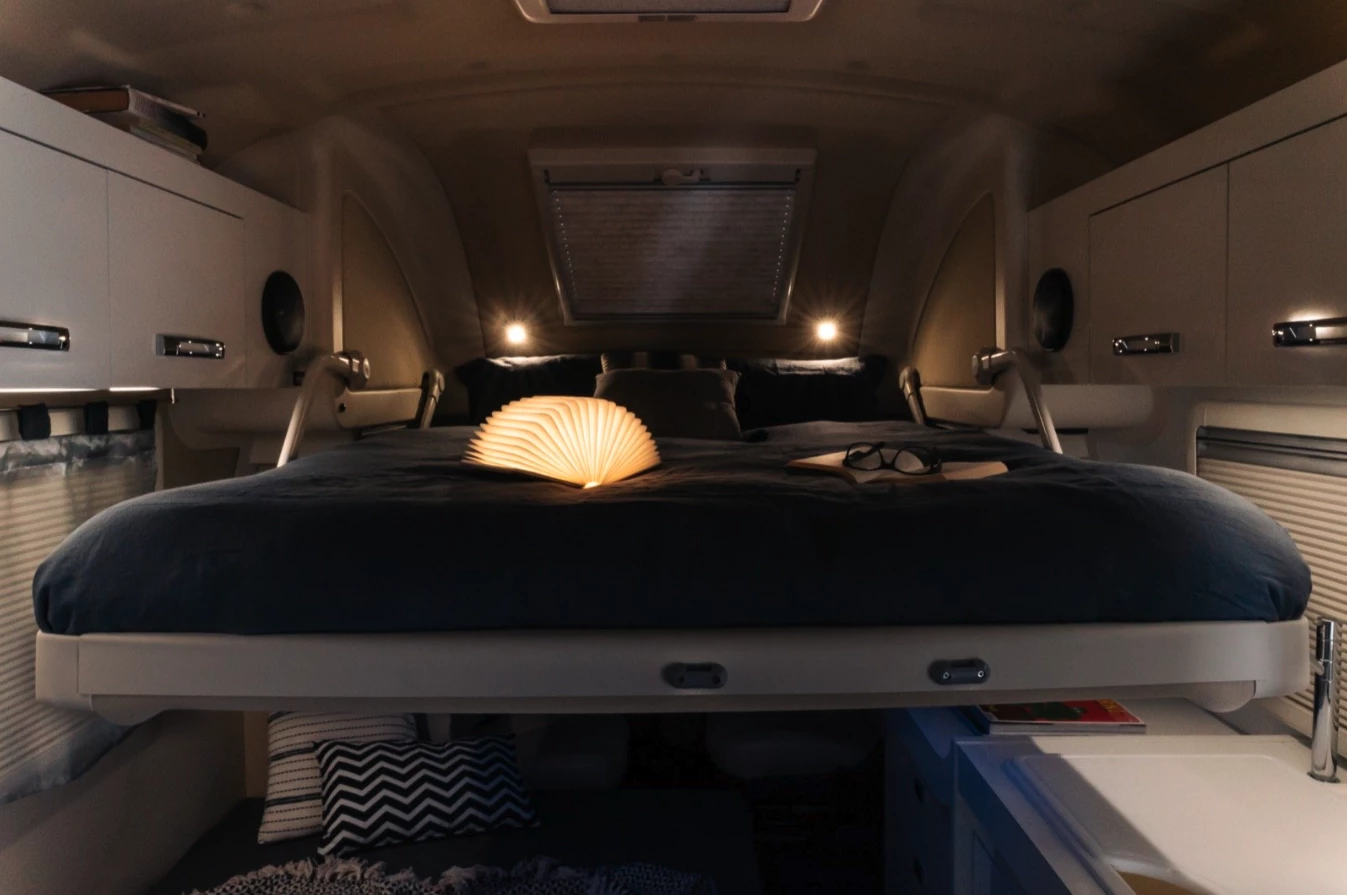 The payoff comes inside, where Wingamm puts the extra height to use in creating a uniquely accommodating interior. It houses the main bed up front, a lift-away that spends the day tucked up against the headliner before strut-dropping down at night to provide 78 x 53 in (198 x 135 cm) of sleeping space below a skylight. A longitudinal orientation allows sleepers to get up and use the bathroom or step outside without rolling over their bedmate.