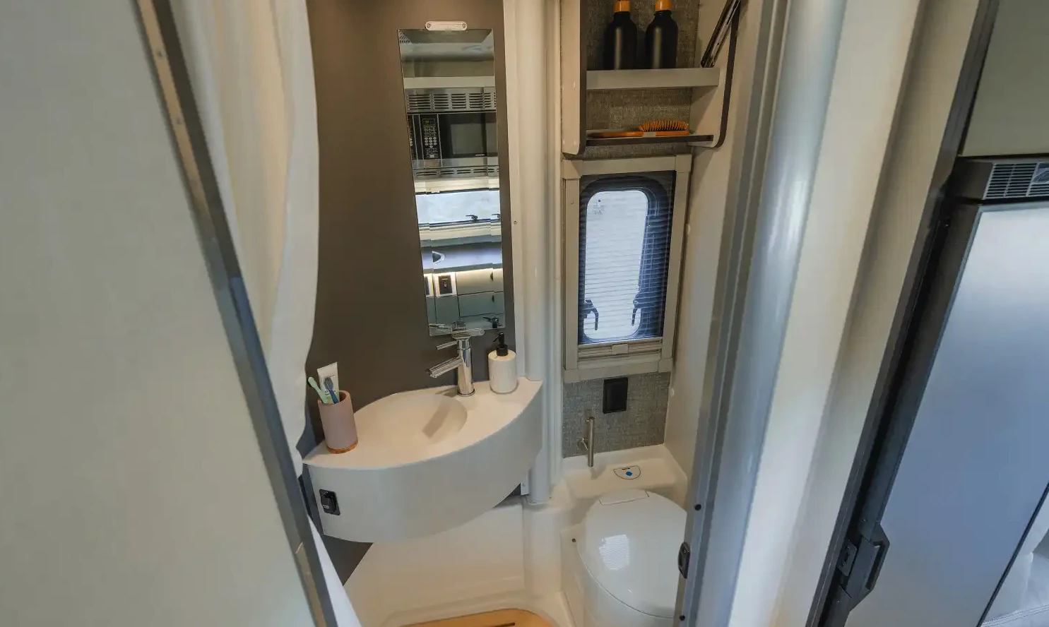 As on the original Transit Ekko, Winnebago installs a trick wet/dry bathroom that uses a swivel wall to close off the sink and pivoting toilet and leave behind a clean, dedicated shower room for a more comfortable lather.