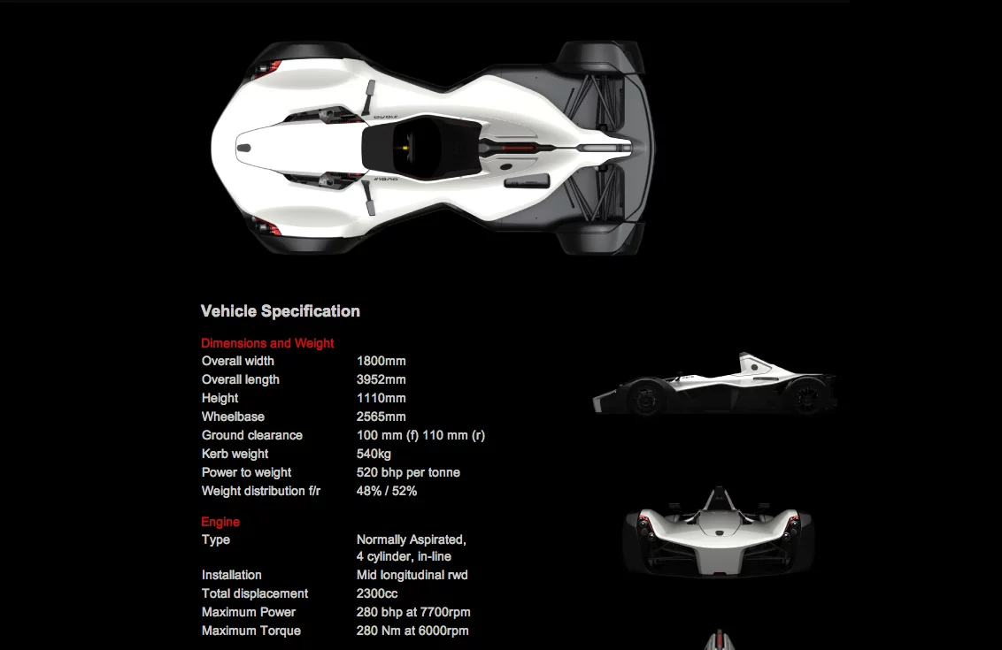 The BAC Mono measures 3.9m long x 1.8m wide x 1.1m high (12.9 x 5.9 x 3.6 ft) with a ground clearance of 100mm (3.9 in) at the front and 110m (4.3 in) at the rear.