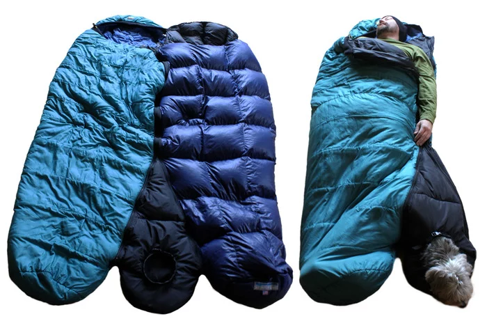 Designed in a teardrop shape, the BarkerBag zips to either side of a standard mummy-style sleeping bag. It can also be attached between two sleeping bags that already mate together. A reinforced cinchable collar keeps the furry friend secure inside the bag and prevents not only heat escaping, but the dog from wandering off by themselves into the night.