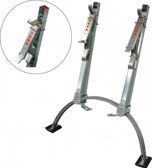 The Easy Connect attachment arms hold the unit in place on the ladder’s rungs. The adjustable locking system is quick and easy to use and the ice-pick feet can sit flat or can be pointed down on hard surfaces to improve traction. The unit has an easy one foot operation and once in place, the ladder is self leveling.