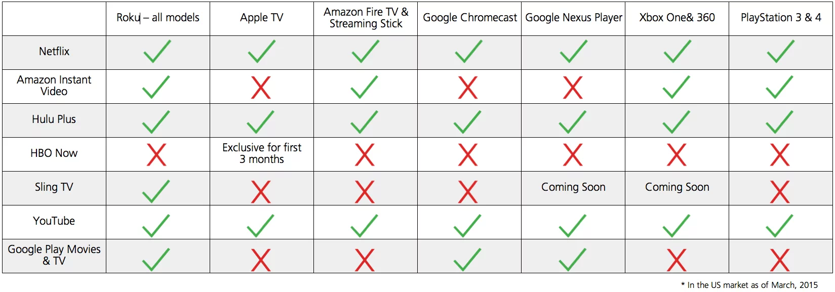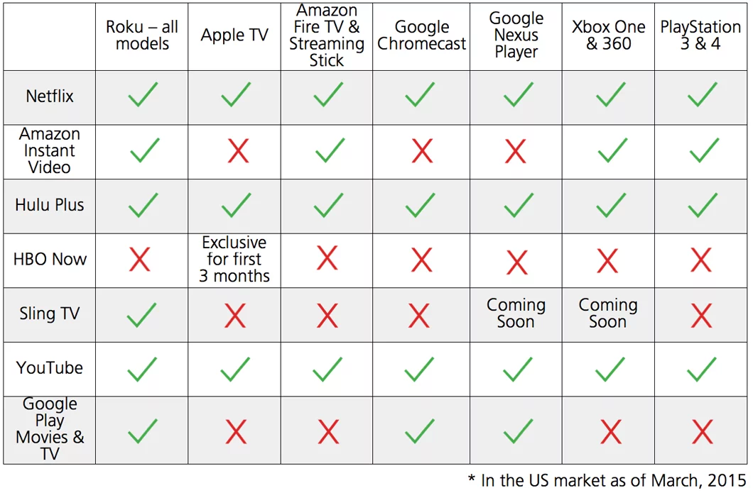 But for those in the US looking to cut the cord, there are a plethora of options available without having to mess around with a VPN, and the market keeps growing. If you're not sure which living room device to start out with, I would recommend heading to the websites of the various streaming services and seeing whose list of content appeals to you most and then check out which device supports your preferred streaming service. Here's a quick look at which of the main streaming services are available on the devices we've mentioned in this story.