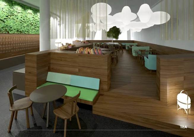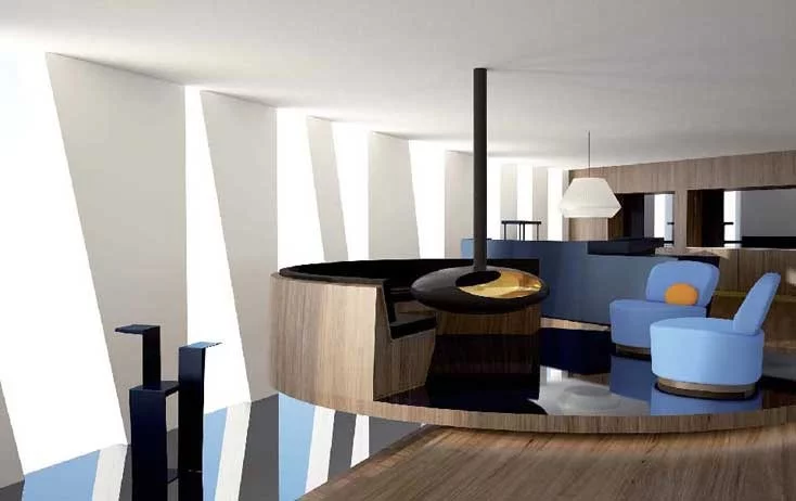 The entrance boasts a stunning light installation and furniture is designed to reflecting the structure of the building's facade, which is notable for its pattern of blue and white triangle shaped glass.
