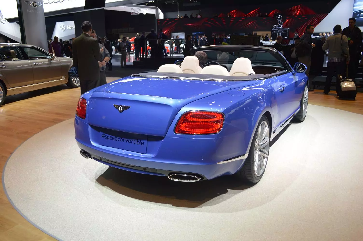 Things quiet down a bit in the Speed Convertible’s interior with diamond-quilted hide upholstery and a finish inspired by the Le Mans-winning Bentleys of the 1920s. On a more modern note, there’s an infotainment system with 15 GB of available storage space which can be expanded via an SD card, connectivity for an iPod or MP3 player, and a built-in six-disc CD changer. For those worried about the weather, Bentley says that the hood can take on a monsoon (presumably when up) and when it’s down, there’s a neck warmer to keep the chill off.