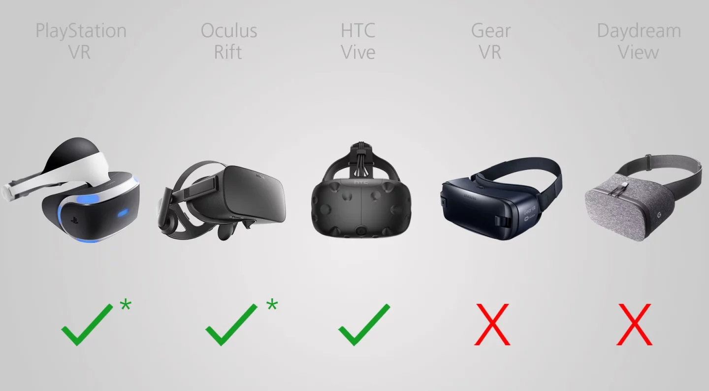 The first three headsets are capable of tracking in full 360 degrees. We put an asterisk next to PSVR, though, because of the tracking quality (or lack thereof). The Rift's asterisk is because you'll have to buy that third sensor to do this, and right now there aren't any Rift games built from the ground-up for full 360 VR.