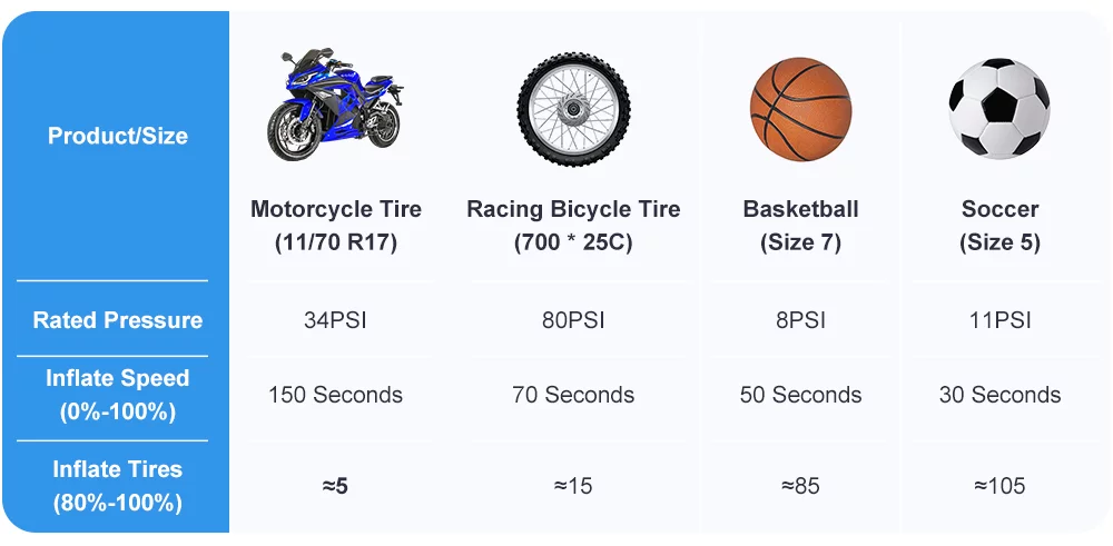 For motorcycles, it’ll take the tires from air to 100 psi in 150 seconds. Given its electric-driven air pump, it can also be used to clean dust out of electronics such as camera bodies.
