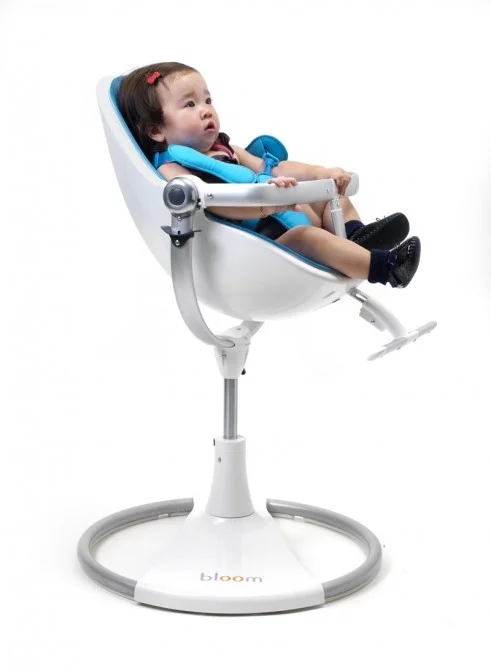 The Fresco works just like an office chair as it has pneumatic-assist, easy-lift height adjustment and the swivel seat rotates 360 degrees allowing multiple positions. The 5-point safety harness with height adjustable shoulder straps will keep your child safe and it moves easily across the floor thanks to the enclosed castor wheels under the front end of the base. It has clean lines and a sleek finish so cleaning should be a breeze and you can choose from five bright micro suede options or three more subdued leatherette options.