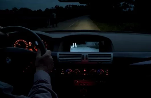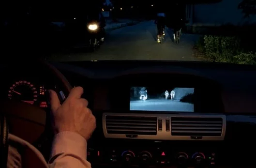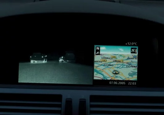 A thermal imaging camera detects human beings, animals and objects in front of the car before they become visible to the human eye in the headlights. The image generated by the system is transmitted to the central Control Display within the car presenting objects detected with increasing brightness as a function of the heat detected by the camera – and therefore making human beings and animals particularly conspicuous. A video of the system can be seen here.