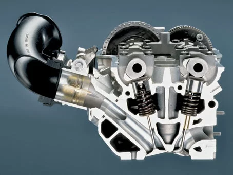 The one-piece aluminium cylinder heads of the V10 engine are arranged in banks. The V10 power unit features four valves per cylinder, a typical BMW trait. All valve train components are of low mass. Thus, for example, the M engines feature for the first time low-weight, flow-optimised 5 mm-shaft valves, spherical valve tappets with hydraulic valve play compensation and single valve springs. All this results in a considerable mass reduction, which is a prerequisite for the realisation of the high-revving concept. The bi-VANOS variable valve timing featured in the new M5 engine ensures an optimum charge cycle, thus helping to achieve extremely short adjustment times. This means in practice: increased performance, an improved torque curve, optimum responsiveness, lower consumption and fewer emissions. Thanks to the bi-VANOS technology, intake and outlet valves are always opened and closed at precisely the right moment. The naturally aspirated engine uses ten flow-optimised intake trumpets to "inhale" air from two intake plenums.