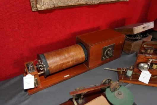 I’ve written about technology of all flavors for three decades, yet his knowledge far surpassed mine, and from one minute to the next I was confronted with pioneering items of quite diverse ilk: a rare 18th century Nairne-pattern electro-static friction generator with insulating table; an eight-plate Wimshurst X-ray generator machine circa 1900; a Cuthbert reflecting microscope which resolved the problem of chromatic aberration circa 1830, plus several examples of very early achromatic microscopes; a movable scale station barometer by Newman circa 1840; some of the earliest man-made magnetic devices; a Sinclair C5 three-wheeled electric scooter, a device far ahead of its time; the producer’s working papers for the world’s first public television program broadcast by the BBC on November 2, 1936; a comprehensive collective of early 19th century experimental vacuum glassware discharge tubes and some of the earliest Braum tubes; an early Geiger counter; early x-ray tubes; an early astronomical heliostat; a rare Henry Negretti table planetarium; a complete technology chain of audio recording devices from wire through to tape; very early video recorders and the first commercially available video camera … it truly was an enlightening experience as my brain was dragged back and forth through scientific experiment and technological innovation across three centuries.