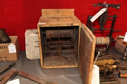 No area of human endeavor and progress seems ignored in the collection. In the home he has early sewing machines, kettles, irons, a range of spits, including clockwork-driven varieties, and a 17th century Spanish food processor that might well be one of the earliest examples of a multi-purpose kitchen appliance incorporating potato cutters, graters, borers, et cetera.