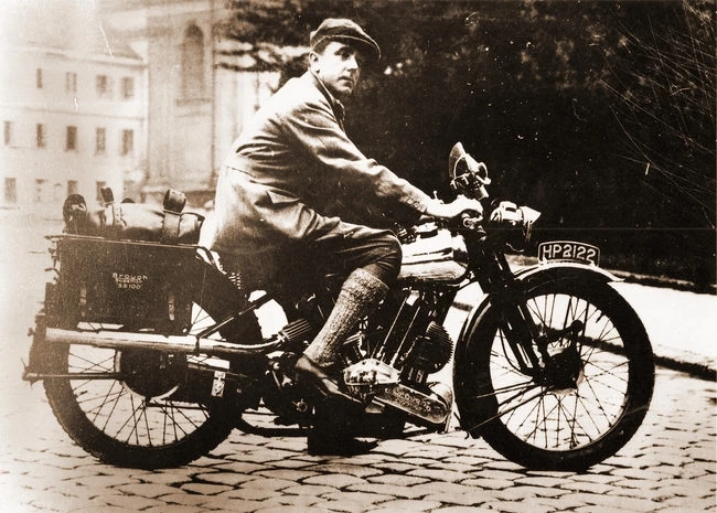 What the well-dressed motorcyclist was wearing circa 1925. A dashing George Brough aboard the prototype Alpine Grand Sport SS100.
