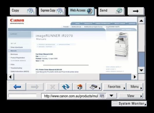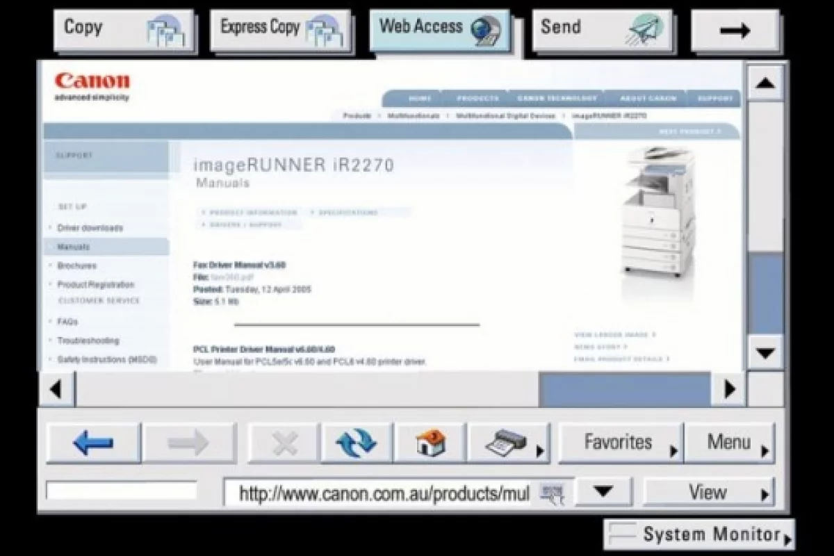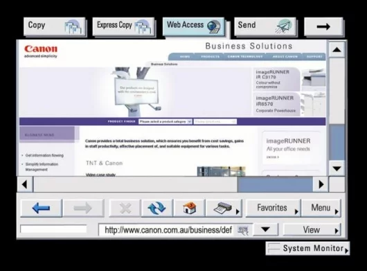 Loaded on a Canon imageRUNNER MFD, the Web Access Software Kit enables users to call up an intranet or the Internet on the full-size colour LCD panel so they can print forms, documents or pages directly. The easy to navigate browser interface includes storage of up to 100 favourite addresses to further simplify use, just like that of a standard browser.