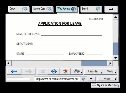 It will also be popular with universities, libraries and all classes of organisations where important documents are regularly updated on an intranet but where access to PCs may not always be available. As employees can access the company intranet direct from the device, frequently accessed documents like leave forms, contracts, maps and manuals can be printed immediately at the MFD. This provides the obvious benefits of not only speed of access and security but most importantly accuracy.