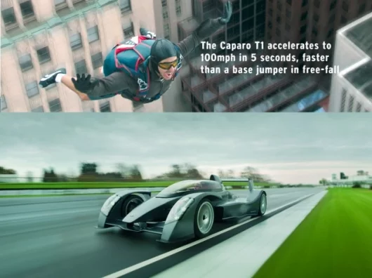 We've written a lot about the Caparo T1 supercar - an aluminium V8 in a carbon fibre tub designed by former McLaren employees to simulate an F1 car on the road. When the Stig ran the T1 on Top Gear's test track, it beat all previous lap times by a whopping SEVEN seconds. Just to prove that too much is never enough, the T1 is now available in a 620 bhp Race Extreme version, aimed specifically at the high end track day market. It can generate 4 G under brakes and 3.5 G during cornering - the sort of G-forces an aerobatic pilot experiences. It accelerates from 0-100 kmh in 2.8 seconds and 0-100mph in 5.8 seconds - faster than a base-jumper in free fall! With a power to weight ratio better than double that of a Bugatti Veyron, this is almost certainly the fastest accelerating production car on the planet!