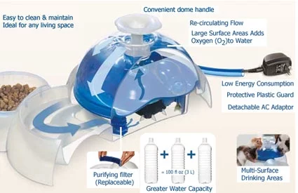 The re-circulating flow and filter eliminates stagnant water and is whisper quiet, whilst the innovative dome design allows water to sheet over the entire surface area to help keep the water cool - and provide a 'licking fountain' for cats to enjoy.The Catit filtered water system has a three litre capacity - which means you don't have to keep filling it up during the day, and is easy to clean and maintain in any living space. It is energy efficient, runs off a 12v system but consumes less than four watts, and has a protective plastic guard to protect the cord from water or chewing by a pet. The purifying filters are replaceable, and help collect debris, hair, food and sediment that might otherwise get into the water.