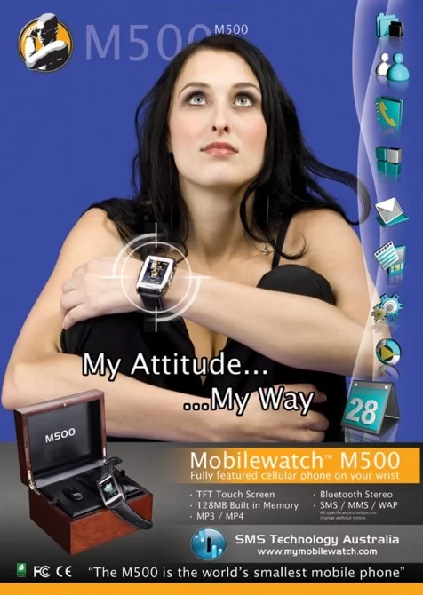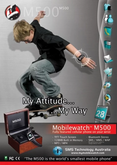 Designed by SMS Technology Australia, the M500 also features full sms functionality, USB connectivity for software uploads, downloads, 300 number memory storage and 40 embedded tones in a slim-line, 60 gm package that looks and wears like a standard watch... and yes, it even tells the time.