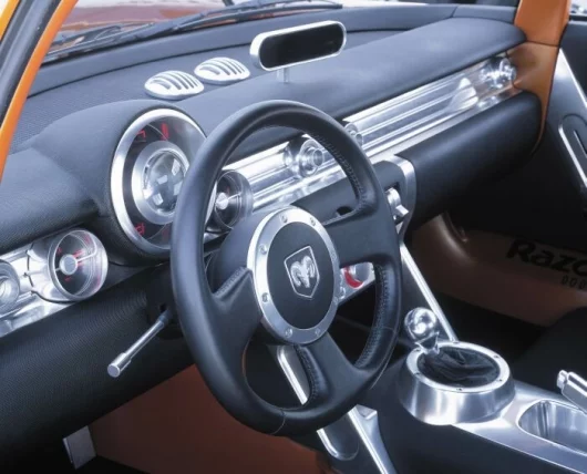 True to minimalist form, Dodge Razor's only ornamentations are the chrome bumpers, the racing-style billet-aluminum gas cap, the classic door handles and mirrors and the jewel-like lamp design. The same holds true for the interior. It offers the necessities for driving, nothing more. No power windows or mirrors, no radio or leather power seats, no frills whatsoever. Dodge Razor offers its two occupants lightweight, competition-style seats, four-point racing harnesses, storage behind their seats and the pure joy of driving.