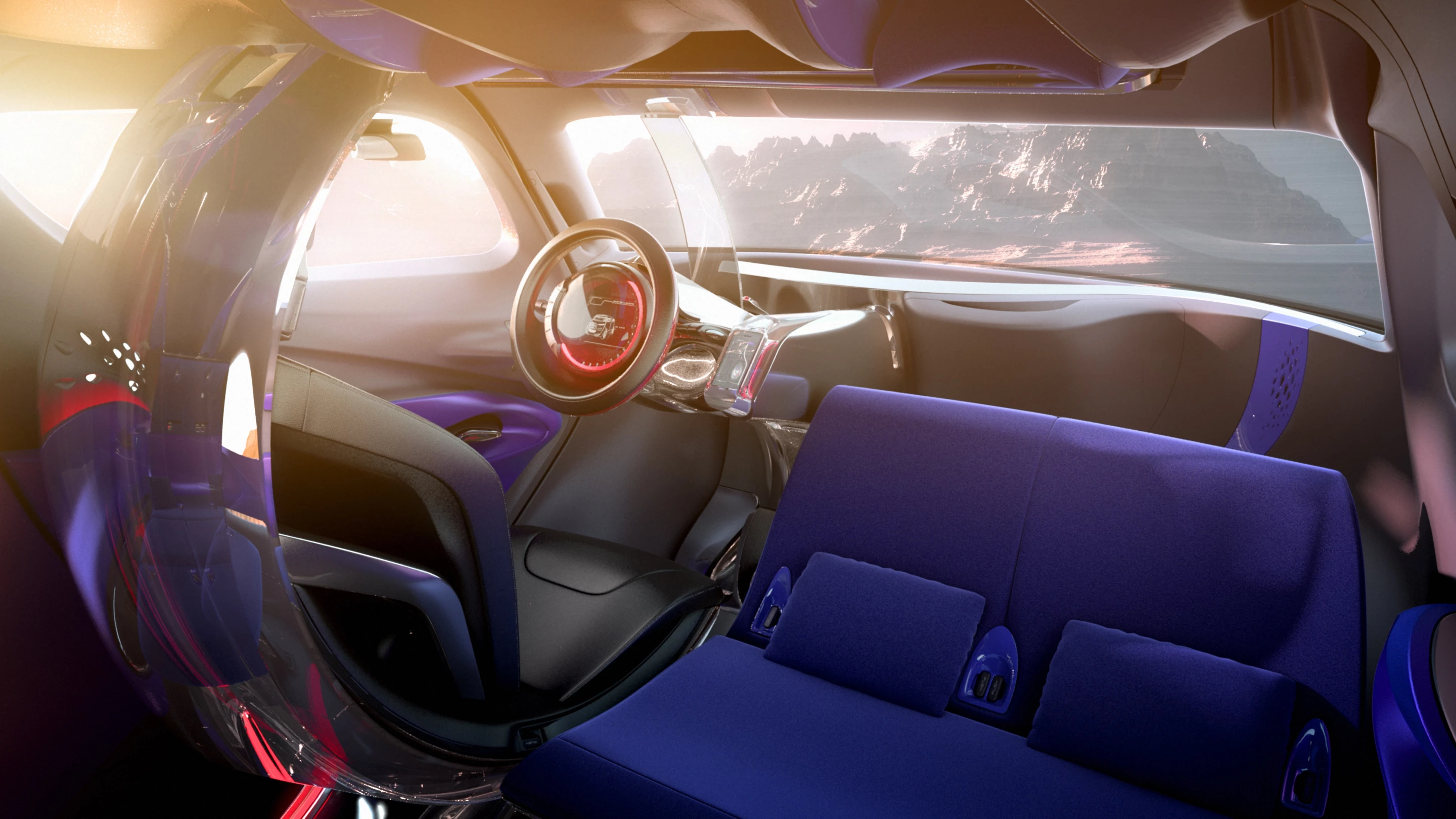 When you get behind the wheel of Tubik, you enter a high-tech world designed around the driving position. This area is dominated by what Citroen designers call the "cyclotron", a system that groups - in one circular line - the seat, pedal assembly, steering wheel and circular head-up display The aluminium grey of the bodywork is also present on the cyclotron, to accentuate its robust, protective looks.