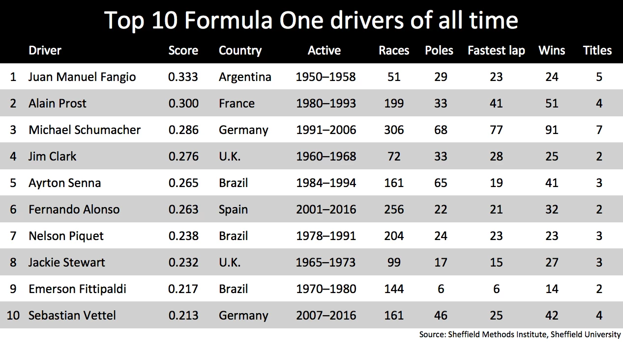 The official explanation and its effects are illustrated by the graphic from the University of Sheffield above, which uses some well known drivers as examples. The ups and downs of some of motor racings biggest names are detailed in the text below, and there are some big surprises.