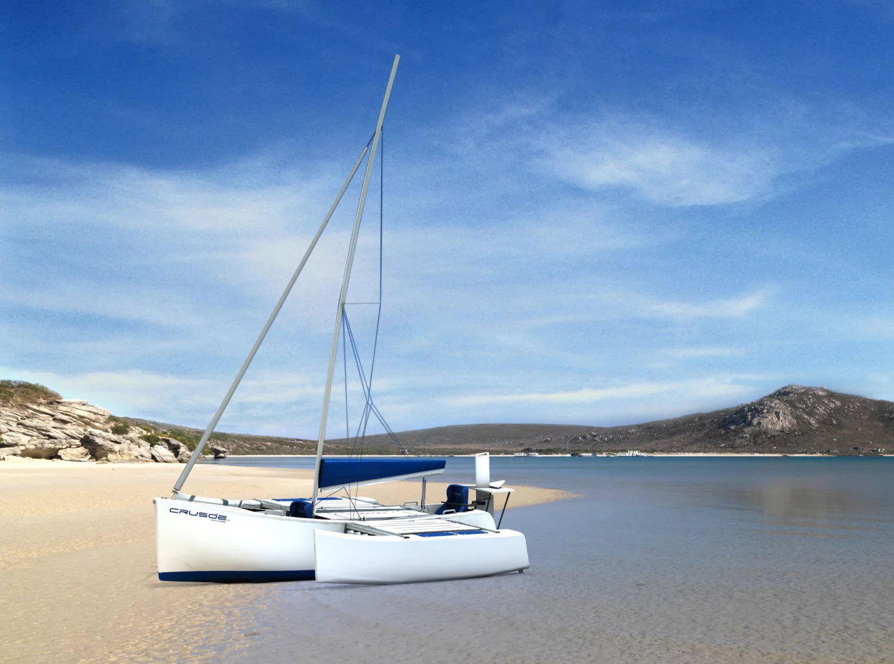 One of the key design parameters of the Crusoe was that it had to have an extremely shallow draft. This was achieved at just 23cm unloaded and 28cm fully loaded. Ask yourself how many 18-foot boats can you know that can sail in less than half a meter of water. What’s more, the hull of the Crusoe Tri is fitted with profiled 38mm x 38mm Teflon rubbing strips on the mid-ships and pontoons ensuring that the hull will not be compromised in the event of a brush with a coral reef, hidden obstacle or a highly abrasive slipway or launching surface.